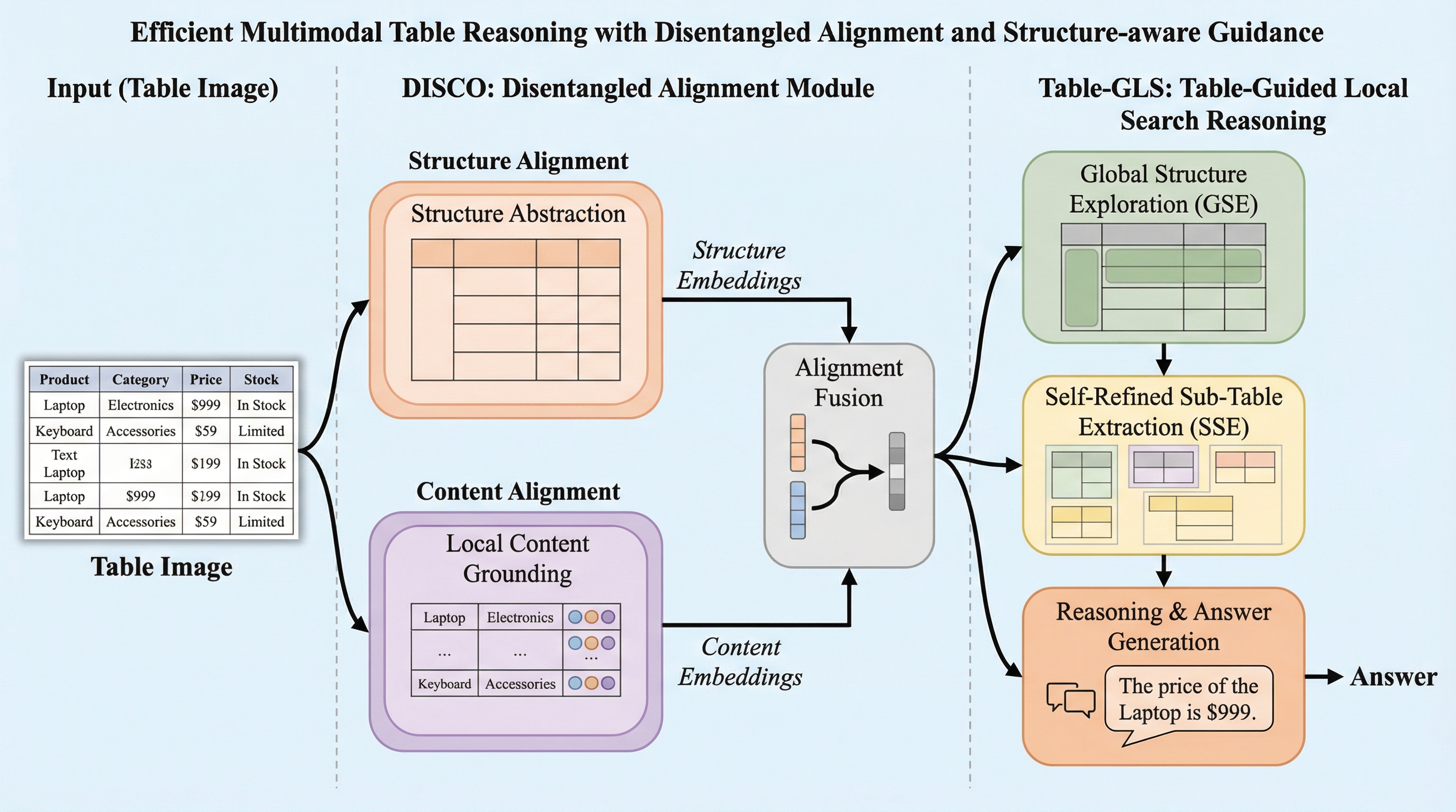 大型視覚言語モデル(LVLM)において、表の複雑なレイアウトと内容が密接に結合している問題を解決するため、構造(骨格)と内容(肉)を分離して学習させる「DISCO」アライメント手法を提案した。 外部ツールや膨大な推論用データに頼らず、表全体から必要な部分を段階的に特定して推論を行う「Table-GLS」フレームワークを導入し、未知の表構造に対しても高い汎用性と信頼性を実現した。 21種類のタスクを用いた検証の結果、わずか1万枚の画像による学習で、従来の大規模データを用いた手法を上回る性能を達成し、効率的かつ解釈可能なマルチモーダル表推論が可能であることを示した。