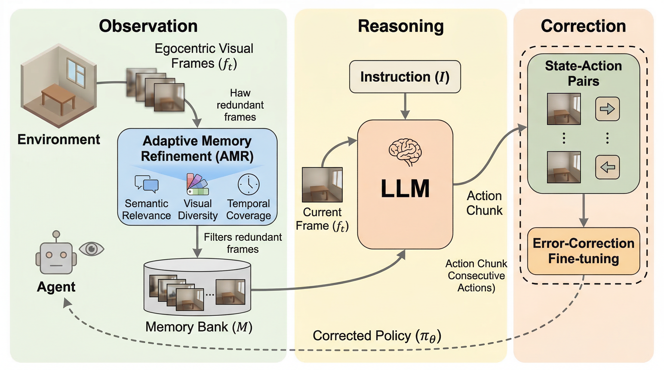 提案の中心は DecoVLN です。名前のとおり、Observation、Reasoning、Correction を分離して設計しています。移動しながら継続的に視界を取り込み、すべてをそのまま推論へ渡すのではなく、まずメモリ側で価値の高いフレームだけを残します。その圧縮された履歴と最新の視界をもとに、行動 chunk をまとめて出力し、さらに trusted region 内で得られた状態行動対で補正学習を行います。