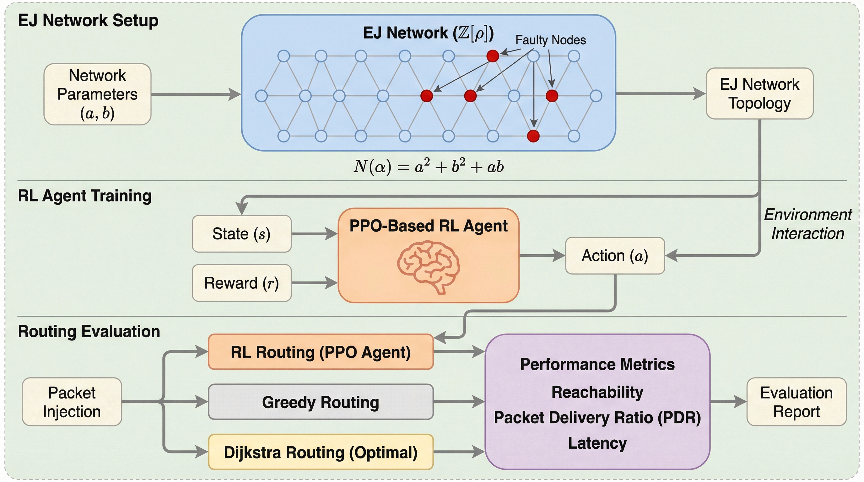本研究では、EJネットワークにおける故障適応型ルーティングのために、深層強化学習(DRL)を用いた新しいアプローチを提案している。具体的には、近接ポリシー最適化(PPO)アルゴリズムを採用し、各ルーターが独立したエージェントとして機能する分散型のルーティングポリシーを構築した。このエージェントは、EJネットワークの6つの隣接ノードの中から、パケットを転送すべき最適な方向を学習する。提案手法の核心は、故障を回避しながら効率的な経路を選択するように設計された多目的報酬関数にある。この報酬関数は、故障ノードへの衝突に対して厳しい罰則を与え、目的地への到達に対して大きな報酬を与え、さらにステップごとに小さなコストを課すことで、最短経路の探索を促すように構成されている。 これにより、エージェントはGreedy手法が陥りやすい「行き止まり」を動的に回避する戦略を獲得する。…