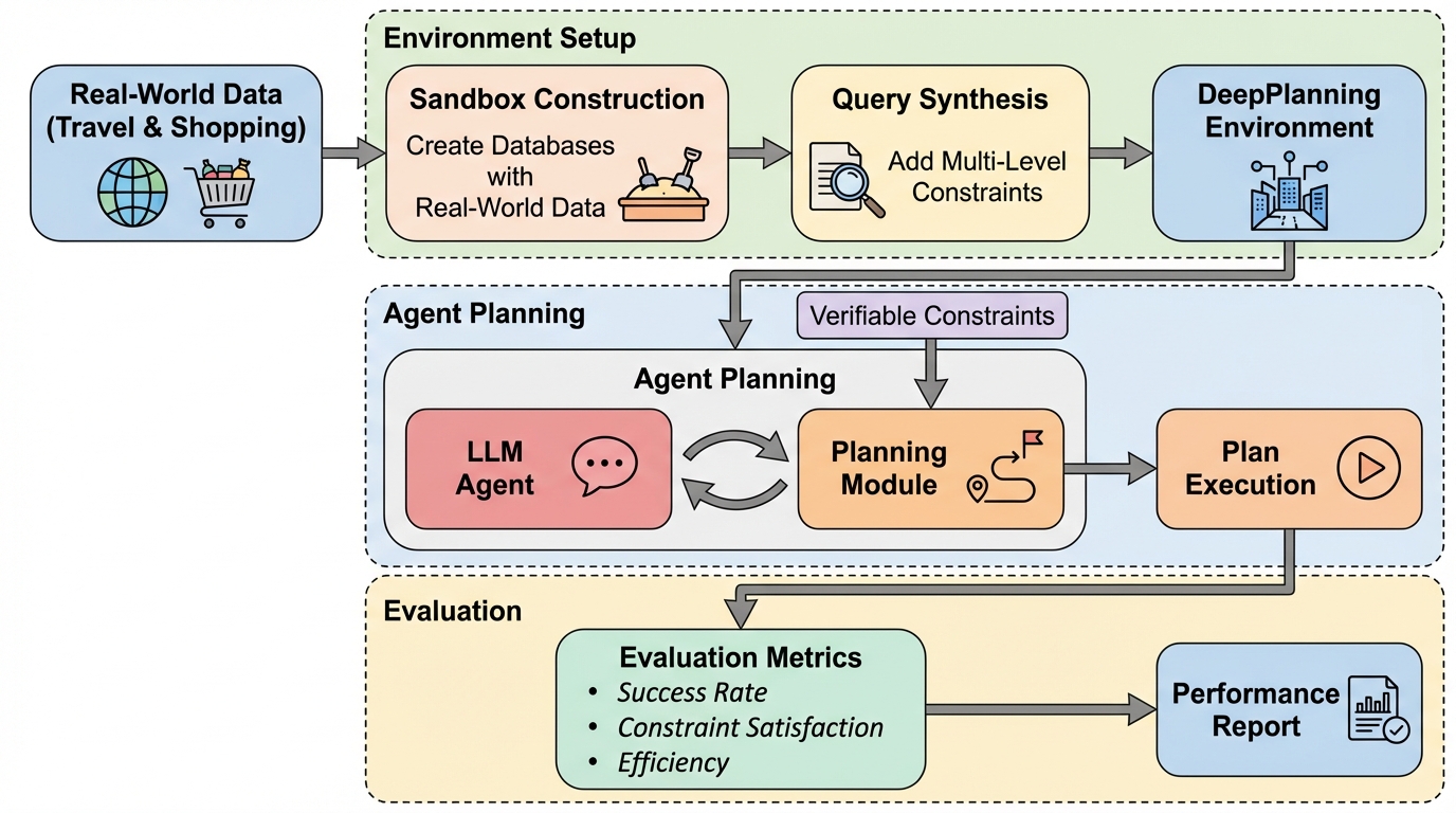 DeepPlanningは、大規模言語モデル(LLM)エージェントが持つ長期的な計画能力を多角的に評価するために開発された新しいベンチマークであり、従来の評価手法が重視していた局所的なステップ単位の推論を超えて、予算や時間といった全体的なリソース制約を最適化する真の計画能力を厳格に測定することを目的としている。 本ベンチマークは、数日間にわたる詳細な旅行計画と、複数の条件を満たす最適な商品購入を行うショッピング計画という2つの複雑な実世界のドメインで構成されており、エージェントは独立したサンドボックス環境内で提供される専用のAPIを能動的に駆使して情報を収集し、論理的な矛盾がなく実行可能な計画を構築することが求められる。 最新の推論型LLMを含む多様なモデルを対象とした大規模な評価の結果、最高性能のモデルであっても複雑な制約が絡み合う状況での整合性維持や暗黙的な環境制約の把握に苦戦しており、長期的な計画タスクを成功させるためには、信頼性の高い明示的な推論パターンや効率的な並列ツール利用といった高度な戦略が不可欠であることが明らかになった。