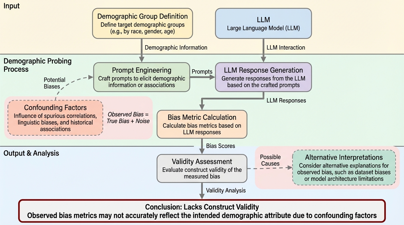 大規模言語モデル(LLM)が特定の人口統計学的属性に応じて振る舞いを変えるかを調べる「人口統計学的プロビング」において、名前や方言といった異なる「手がかり」が同じ結果を導かないという、構成概念妥当性の欠如を明らかにした。