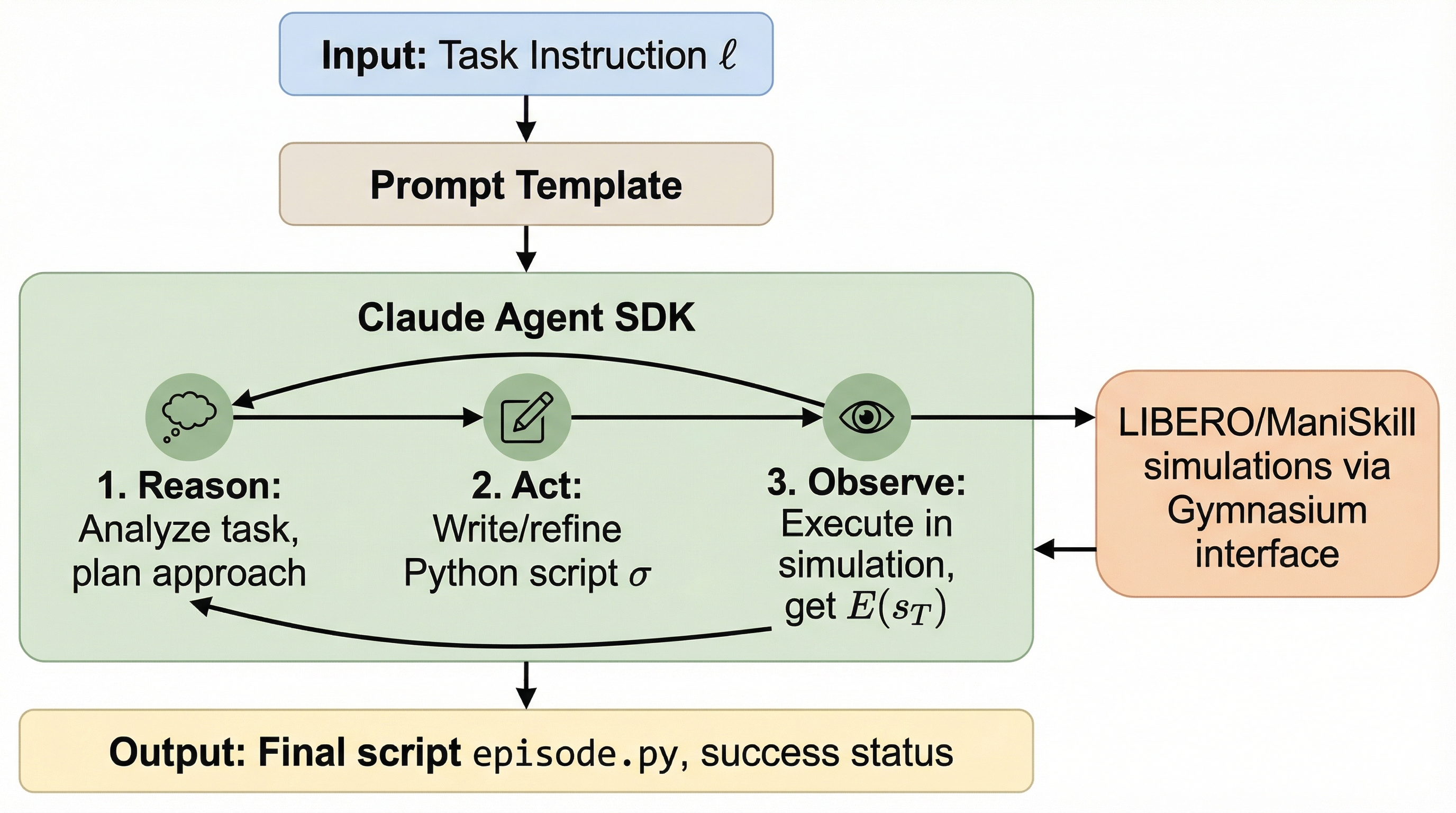 FAEA(Frontier Agent as Embodied Agent)は、ソフトウェア開発用に設計された汎用LLMエージェントであるClaude Agent SDKを、一切の変更を加えずそのままロボット操作に適用した手法であり、事前のデモンストレーションや追加学習を必要とせずに、試行錯誤を通じたプログラム合成によって自律的にタスクを遂行する。 LIBERO、ManiSkill3、MetaWorldという3つの主要なベンチマークにおいて、特権的な環境状態を利用することでそれぞれ84.9%、85.7%、96%という高い成功率を達成し、最大100件のデモンストレーションで学習した既存の視覚・言語・行動(VLA)モデルに匹敵、あるいはそれを上回る性能を示した。 この手法は、エージェントがシミュレーション内で自律的に成功軌道を生成できるため、ロボット学習のためのデータ拡張ツールとしての実用性が高く、汎用モデルの進化やエージェント基盤の改善がそのままロボット制御の向上に直結する新しいパラダイムを提示している。