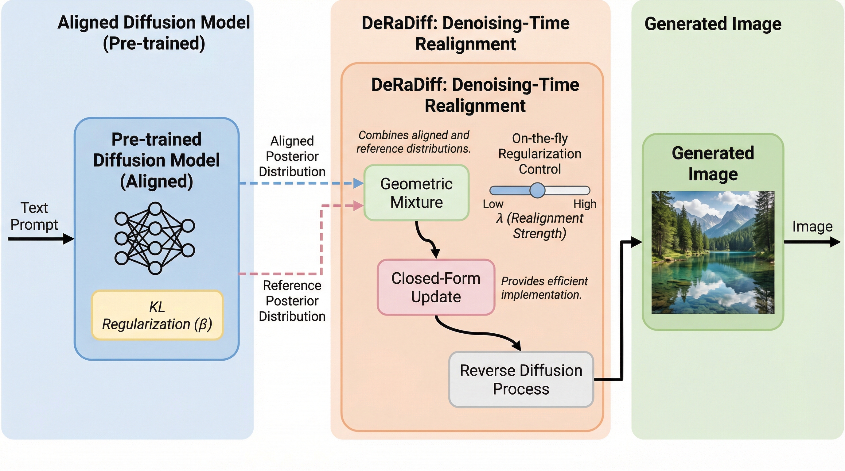 拡散モデルを人間の好みに適合させるアライメント工程において、事前学習モデルからの乖離を抑える正則化強度($\beta$)の選択は、画質と忠実度のバランスを左右する極めて重要な課題ですが、最適な値を見つけるための再学習には膨大な計算コストがかかっていました。 本研究が提案する「DeRaDiff」は、一度だけアライメントを行ったモデルを基点(アンカー)とし、推論時のサンプリング過程において参照モデルと幾何学的に混合することで、追加学習を一切行わずに正則化強度を動的に制御することを可能にする革新的な手法です。 実験ではSDXL等の大規模モデルを用い、異なる強度でゼロから再学習したモデルの出力を極めて高い精度で近似できることが示され、計算資源を大幅に節約しながら、人間の好みに基づく最適な画像品質とプロンプトへの忠実度を即座に探索・調整できるようになりました。