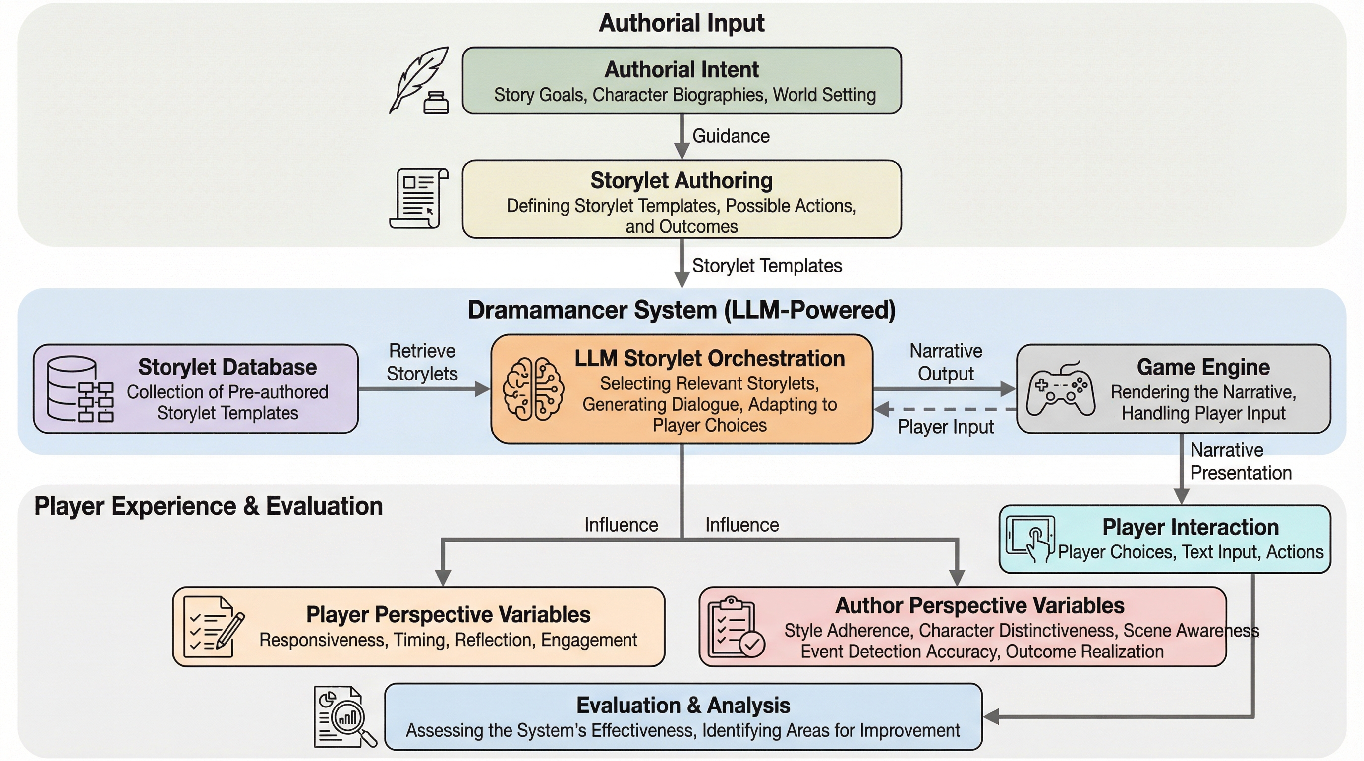 Dramamancerは、作者が定義した物語の構造である「ストーリー・スキーマ」を、大規模言語モデル(LLM)を用いて動的なプレイ体験へと変換する革新的なシステムであり、作者の創作意図を維持しながらプレイヤーに高い主体性を提供することを実現している。 作者は物語のスタイル、登場人物、シーン、そして特定の条件で発動する「ストーリーレット」形式のイベントを定義し、システム内の「インスタンス化」と「解釈」という二つのLLMモジュールが、プレイヤーの自由な入力に応じてリアルタイムで一貫性のある物語テキストを生成する。 本研究は、AIを用いた物語制作における作者・プレイヤー・LLMの役割分担を明確にし、スタイルの遵守やイベント検出の正確性、プレイヤーの没入感といった多角的な評価指標を提示することで、次世代のインタラクティブな物語体験の設計指針を確立した。