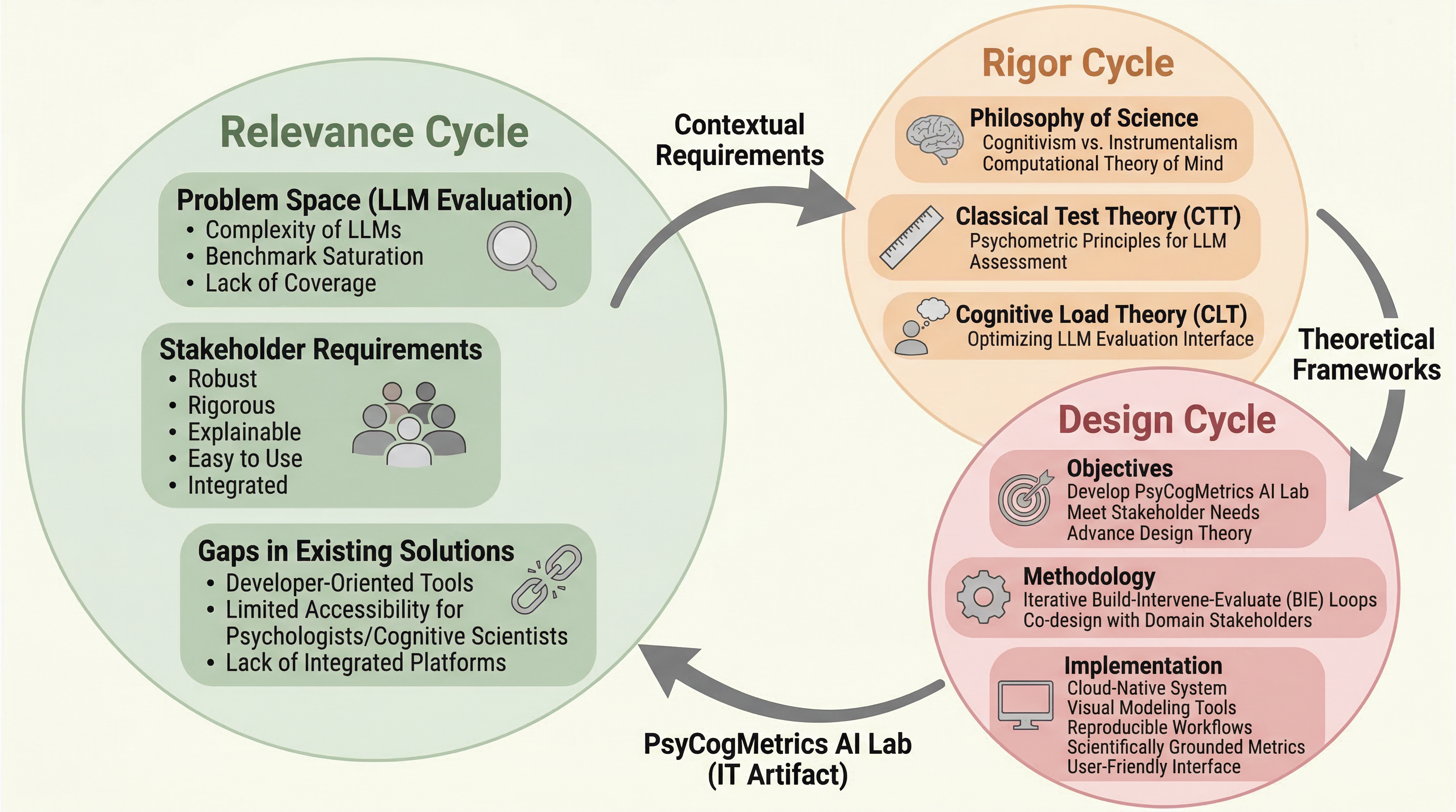 PsyCogMetrics AI Lab は、心理測定学と認知科学の方法論を取り込みつつ、クラウド上で使える統合評価プラットフォームとして設計された IT アーティファクトです。論文の核心は、評価結果そのものよりも、three-cycle Action Design Science によって LLM 評価基盤をどう設計すべきかを具体化した点にあります。