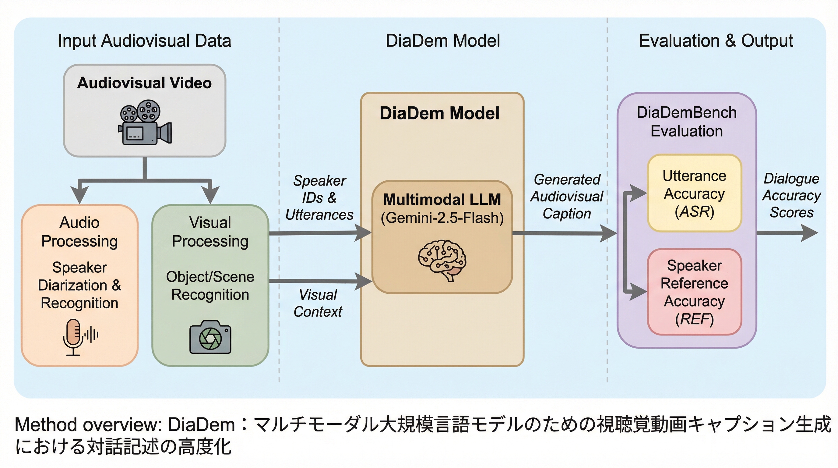 視聴覚動画キャプション生成において、従来のモデルは「誰が何を話したか」という対話の正確な記述、特に複数人による複雑なシーンでの話者特定や発話の書き起こしに大きな課題を抱えていた。 本研究では、対話記述の精度を大幅に向上させた新モデル「DiaDem」と、話者特定(REF)と発話書き起こし(ASR)の正確性を厳密に評価するための初となる専用ベンチマーク「DiaDemBench」を提案した。 高品質な合成データを用いた教師あり微調整(SFT)と、難易度別に分割された二段階のGRPO戦略を組み合わせることで、DiaDemは対話記述の正確性においてGeminiシリーズを上回る性能を達成し、一般的なキャプション生成能力も高い水準で維持している。