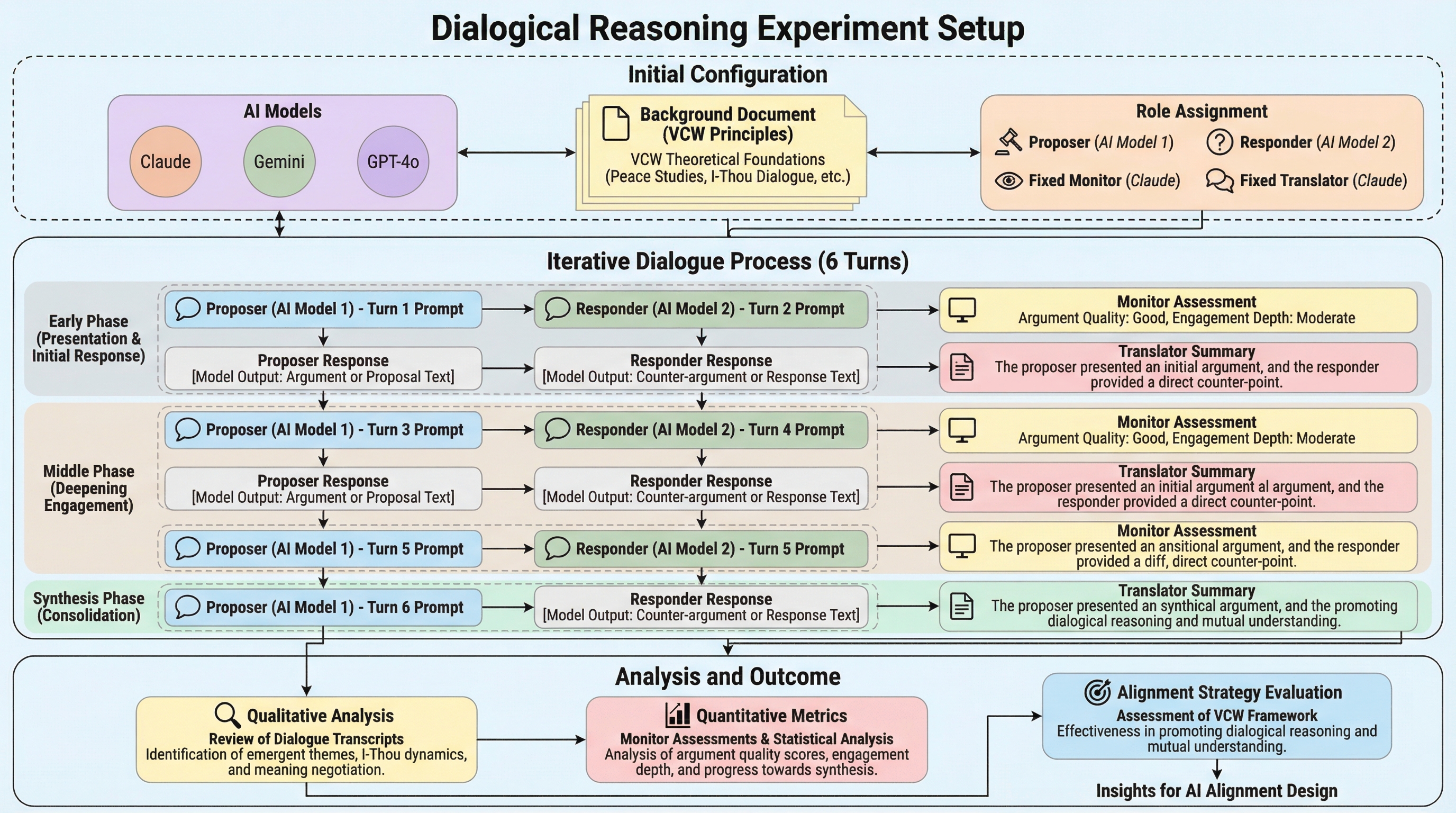 従来のAIアライメント評価は単一モデルによる静的な手法が主流であったが、本研究は平和学の知見を取り入れ、複数のAI(Claude、Gemini、GPT-4o)が異なる役割(提案者、応答者、監視者、翻訳者)を演じて対話を行うことで、アライメント提案を動的にストレステストする新しいフレームワークを開発した。 実験の結果、各AIモデルは平和学の複雑な概念を理解し、Claudeは検証の課題、Geminiは偏りや拡張性、GPT-4oは実装の障壁といった、モデル固有の視点から補完的な批判を提示できることが示され、対話を通じて「移行期フレームワークとしてのVCW」といった初期段階には存在しなかった新しい洞察が生成された。 合計72ターンの対話データ(約57万文字)の分析により、構造化された多段階の対話が単なる合意形成や繰り返しの議論に陥ることなく、深い関与と相互の変容を促すことが確認され、AIアライメントを単なる「制御」の問題から「関係性」の問題へと再定義する「Viral Collaborative Wisdom(VCW)」の有効性を検証する強力な手法が提供された。