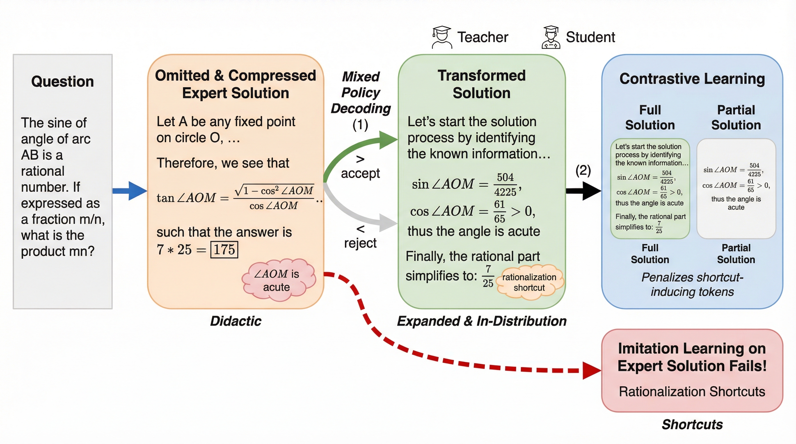 論文が提案するのは Distribution Aligned Imitation Learning(DAIL) という2段階の方法です。 狙いは一言でいえば、「専門家の解答」をそのまま真似るのではなく、まず“モデルが学べる形”に作り替えてから学ぶこと。ここでの主役は「解答」そのものよりも、解答へ至るプロセスを、モデル側の学習都合に合わせて再設計する手続きです。