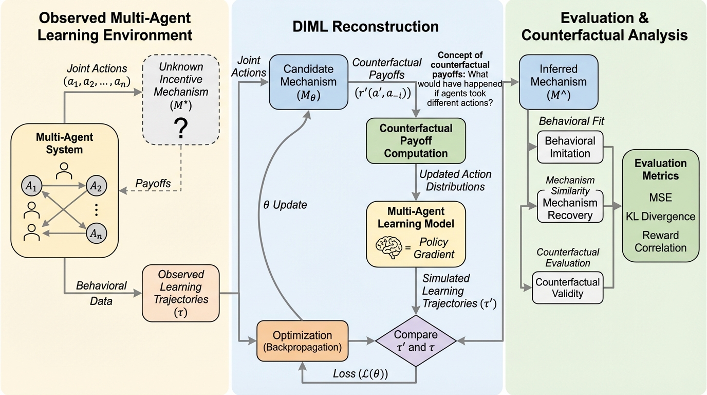 本研究は、複数のエージェントが相互に影響し合う環境において、観測された行動履歴(学習軌跡)のみから背後にある未知の報酬生成メカニズムを特定する「逆メカニズム学習」のフレームワーク「DIML」を提案する。 DIMLはエージェントの学習プロセスを微分可能なモデルとして扱い、実際には選択されなかった行動に対する「反事実的な報酬」を予測に組み込むことで、平衡状態ではない過渡的な学習行動からも報酬構造を高い精度で復元できる。 実験では、ニューラルネットワークで構成された複雑な報酬系や、交通渋滞の課金、公共財の補助金、100人規模の匿名ゲームなど多様な環境において、既存手法を凌駕する精度と大規模システムへのスケーラビリティを実証した。