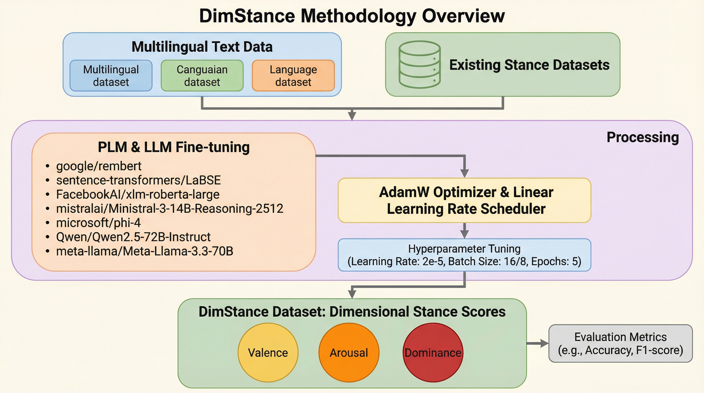 従来のスタンス検出は「賛成」「反対」「中立」といったカテゴリ分類が主流であったが、本研究では感情科学の枠組みを導入し、感情の価数(ポジティブ・ネガティブ)と覚醒度(穏やか・活発)という連続的な数値でスタンスを捉える新しいアプローチを提案した。英語、ドイツ語、中国語に加え、低リソース言語であるナイジェリア・ピジン語やスワヒリ語を含む5言語、政治と環境保護の2ドメインを対象とした、11,746件のターゲット・アスペクトを含む初の実数値アノテーション付きデータセット「DimStance」を構築した。大規模言語モデル(LLM)を用いた回帰タスクの検証により、微調整されたモデルが高い性能を示す一方で、低リソース言語における精度の課題や、トークンベースの予測の限界が明らかになり、今後の多言語かつ感情を考慮したスタンス分析の基盤を提示した。