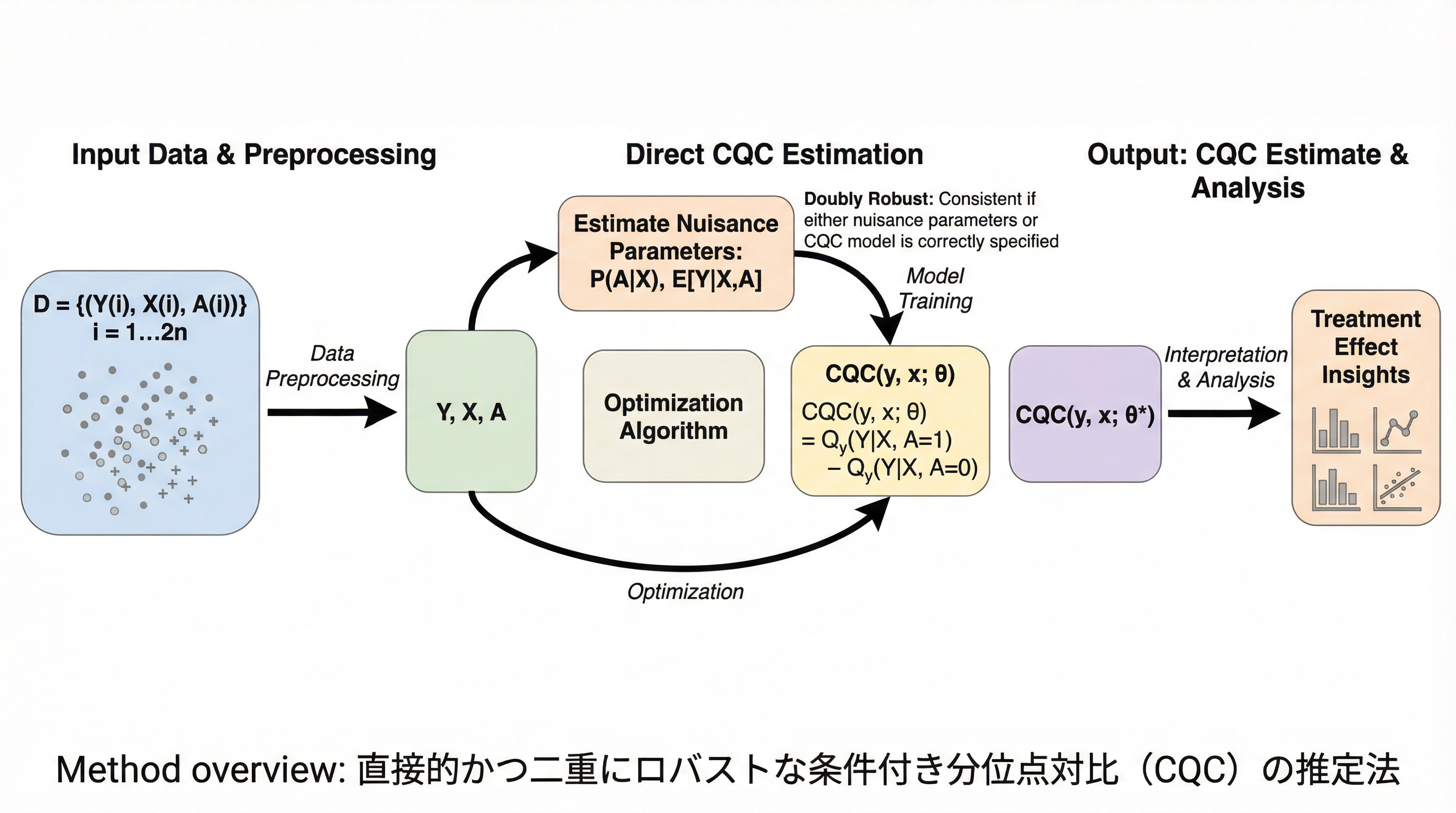 現代のデータ分析において、個々の属性に応じた最適な治療や介入を選択する不均一治療効果(HTE)分析の需要は急速に高まっている。この分野では、条件付き平均治療効果(CATE)や条件付き分位点治療効果(CQTE)といった指標が広く用いられてきた。CATEは解釈性が高く推定の保証も強いが、平均値のみに焦点を当てるため、所得や医療データのように分布が大きく歪んでいる場合や、極端な値が含まれる場合にその影響を強く受けすぎるという弱点がある。一方でCQTEは分布の各分位点における詳細な情報を提供するが、入力が分位点レベルであるため、実際の反応値に基づいた直感的な解釈が困難になる場合がある。これらの中間に位置する有望な指標として提案されたのが条件付き分位点対比(CQC)である。CQCは、ある個体が治療を受けなかった場合の反応値を、治療を受けた場合の同等の分位点における反応値へと変換する写像として定義される。この指標は、治療が反応値を「2倍にする」あるいは「一定量増やす」といった、実務者が日常的に用いる言葉により近い形で治療効果を表現できる。 しかし、従来のCQC推定法には実用上の重大な制限が存在していた。…