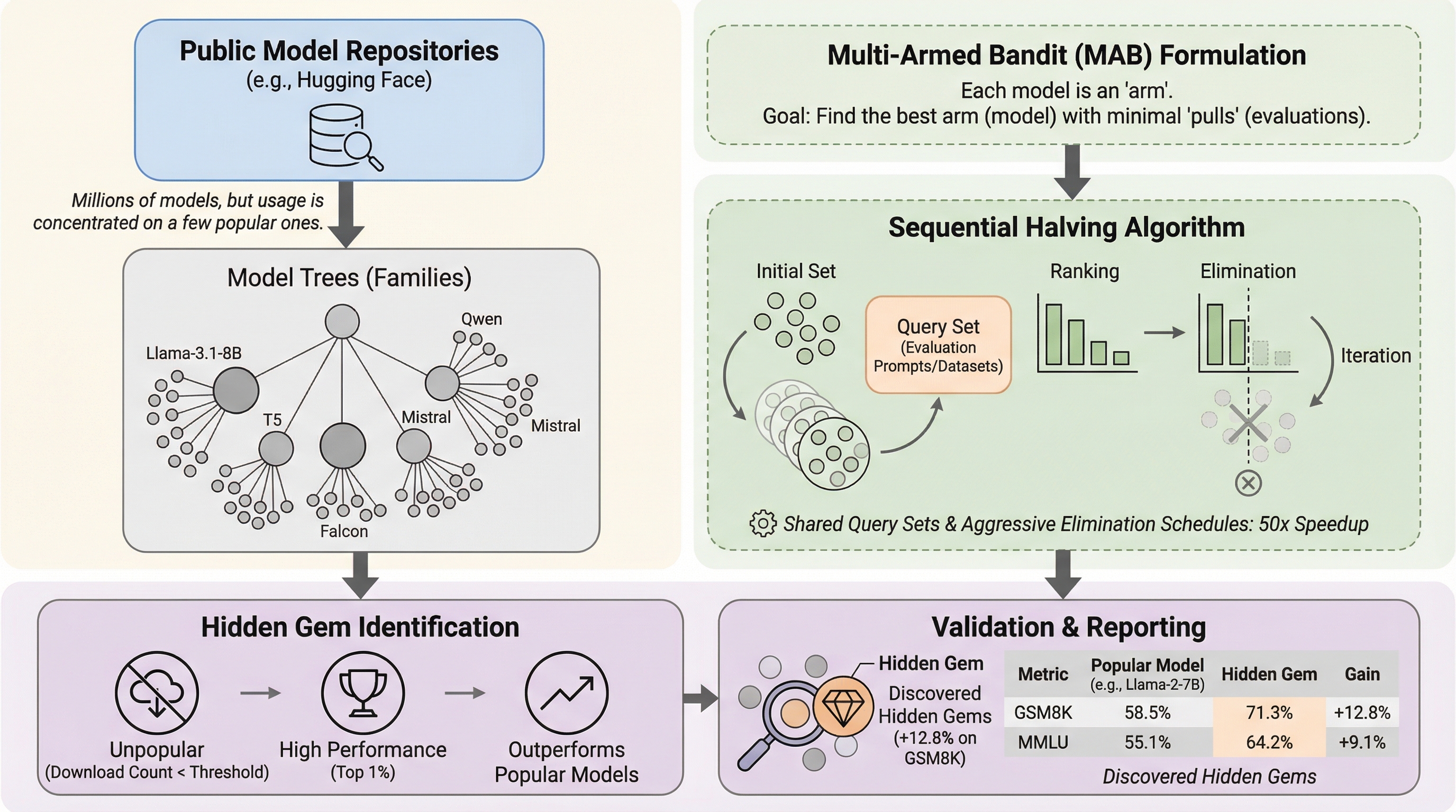 Hugging Face等の公開リポジトリには数百万のモデルがホストされているが、利用実態は極めて一部の公式モデルに集中しており、優れた性能を持ちながらも月間ダウンロード数が極少数の「隠れた名作(Hidden Gems)」が膨大に埋もれている実態を、2,000以上のモデル評価を通じて明らかにした。 Llama-3.1-8Bにおいて数学性能を83.2%から96.0%へ劇的に向上させる無名モデルや、Mistral-7Bにおいて数学性能を40%以上改善するモデルを発見し、ダウンロード数などの人気指標が必ずしもモデルの真の性能や価値を反映していないことを客観的な数値データに基づき証明した。 膨大な候補からこれらを効率的に見つけ出すため、マルチアームバンディット理論に基づく加速型Sequential Halvingアルゴリズムを提案し、モデルあたりわずか50クエリという従来の網羅的評価の50倍以上の高速さで、トップクラスのモデルを確実に特定する実用的な探索手法を確立した。