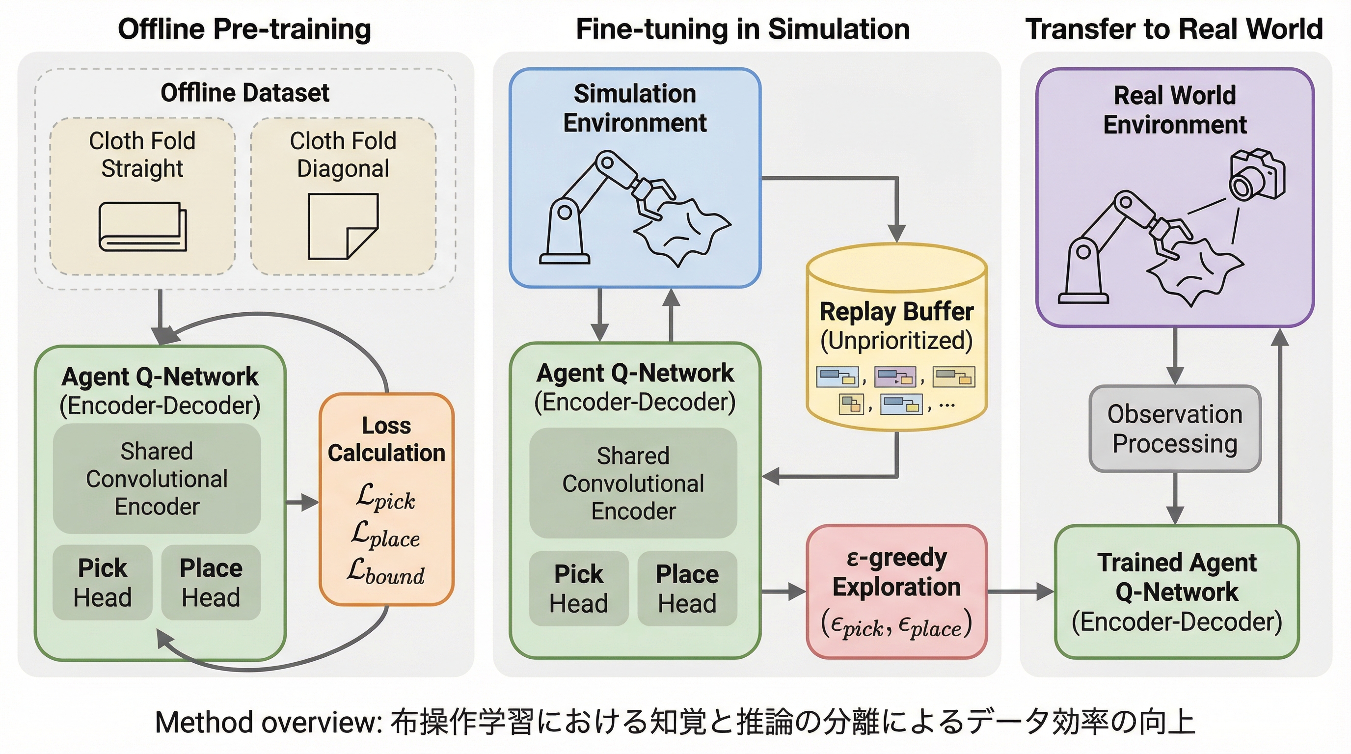 日常生活における布の操作は、ロボット工学において依然として解決されていない大きな課題の一つである。布は形状が定まらない柔軟な物体であり、その状態空間は極めて高次元であることに加え、自己遮蔽が発生しやすく、動力学的な挙動も非線形で複雑である。高齢化社会が進む中で、日常生活動作(ADL)を支援するロボットの需要は高まっているが、硬い物体や関節を持つ物体の操作に比べて、布のような変形する物体の操作技術は大きく遅れている。従来の深層学習や強化学習を用いたアプローチでは、これらの課題に対処するために巨大なモデルと膨大な訓練時間を必要としてきた。特に、計算コストの増大は手法の開発や普及を妨げる大きな要因となっている。 また、多くの既存手法はワークスペースの画像を入力とするエンドツーエンドの学習を採用している。この方式はシミュレーションから現実世界への転移を概念的には容易にするが、知覚、探索、推論のプロセスが密結合しており、どの要素が性能に寄与しているのかを特定することが困難であった。さらに、画像ベースの学習は環境状態の表現において情報損失が大きく、エージェントの訓練に多大な計算負荷を強いることになる。…