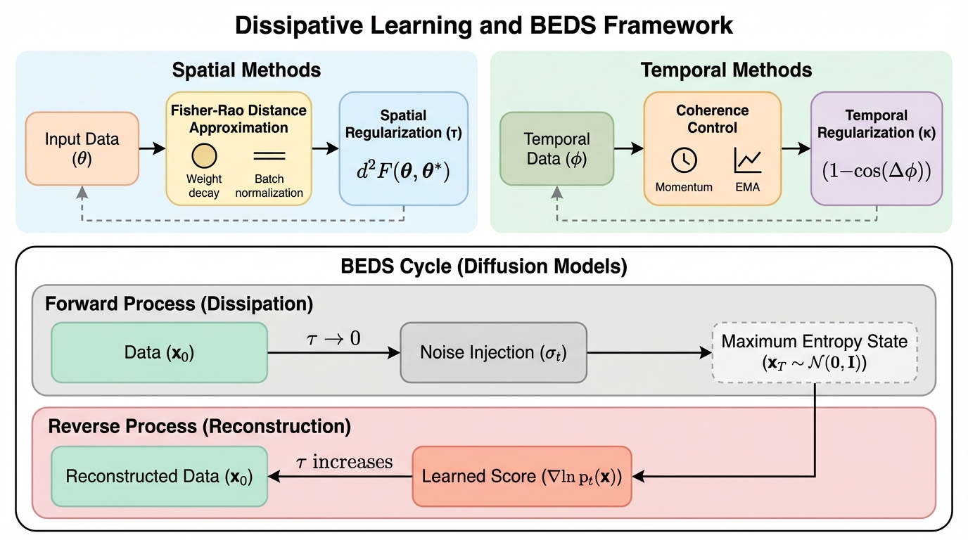 学習を本質的にエネルギーを消費し情報を捨てる「散逸プロセス」と定義し、忘却や正則化をシステムの生存に不可欠な構造的要件として再構築するBEDSフレームワークを提案している。 情報幾何学と熱力学に基づき、フィッシャー・ラオ正則化が最小の散逸で学習を実現する唯一の最適戦略であることを理論的に証明し、既存の多様な機械学習手法を単一の方程式で統一的に説明することに成功した。 過学習を「過剰な結晶化」、壊滅的忘却を「散逸制御の不全」と捉え直し、有限のリソース下で精度と適応性のバランスを維持し続ける「生存可能性」を、従来の評価基準に代わる新たな指標として提示している。