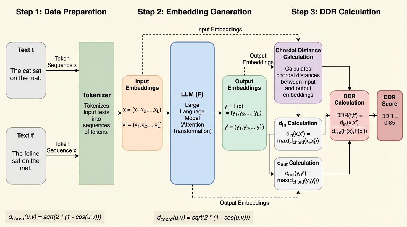 本論文では、LLMの文埋め込み間の新しい類似度指標として「DDR(Distance-to-Distance Ratio:距離対距離比)」を導入しました。この指標は、関数の変化率を測定するリプシッツ定数や、リプシッツ型の距離拡大の概念から着想を得ています。DDRは、コンテキスト適用前の単語埋め込み間の類似性と、コンテキスト適用後のLLM埋め込み間の類似性の変化率を測定するものです。これにより、コンテキストが持つ意味的な影響力を直接的に数値化することが可能になります。DDRの大きな特徴は、事前と事後の距離を個別に扱うのではなく、その「比率」を直接計算する点にあります。先行研究によれば、基礎となる量そのものを推定するよりも、比率を推定する方が数学的に堅牢である場合が多いことが示されています。…