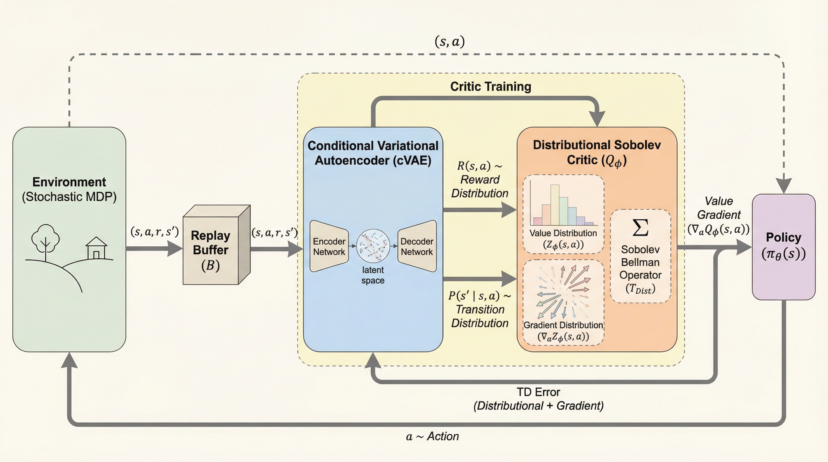 連続アクション空間の強化学習において、報酬の期待値だけでなく、累積報酬とそのアクション勾配の両方をジョイント分布として同時にモデル化する「分布型ソボレフ学習」という新しい枠組みを提案した。 理論面では、最大スライス最大平均不一致(MSMMD)という指標を用いることで、提案したソボレフ・ベルマン演算子が唯一の不動点に収束する縮小写像であることを数学的に証明し、さらに条件付き変分オートエンコーダ(cVAE)を用いた微分可能なワールドモデルを導入することで、非微分可能な環境への適用を可能にした。 実験では、マルチモーダルな不確実性を持つトイタスクやMuJoCoベンチマークにおいて、従来の決定論的な勾配手法や勾配を考慮しない分布型手法を大幅に上回るサンプル効率と堅牢性を実証し、勾配情報の分布を捉えることが連続制御における学習に極めて有効であることを示した。