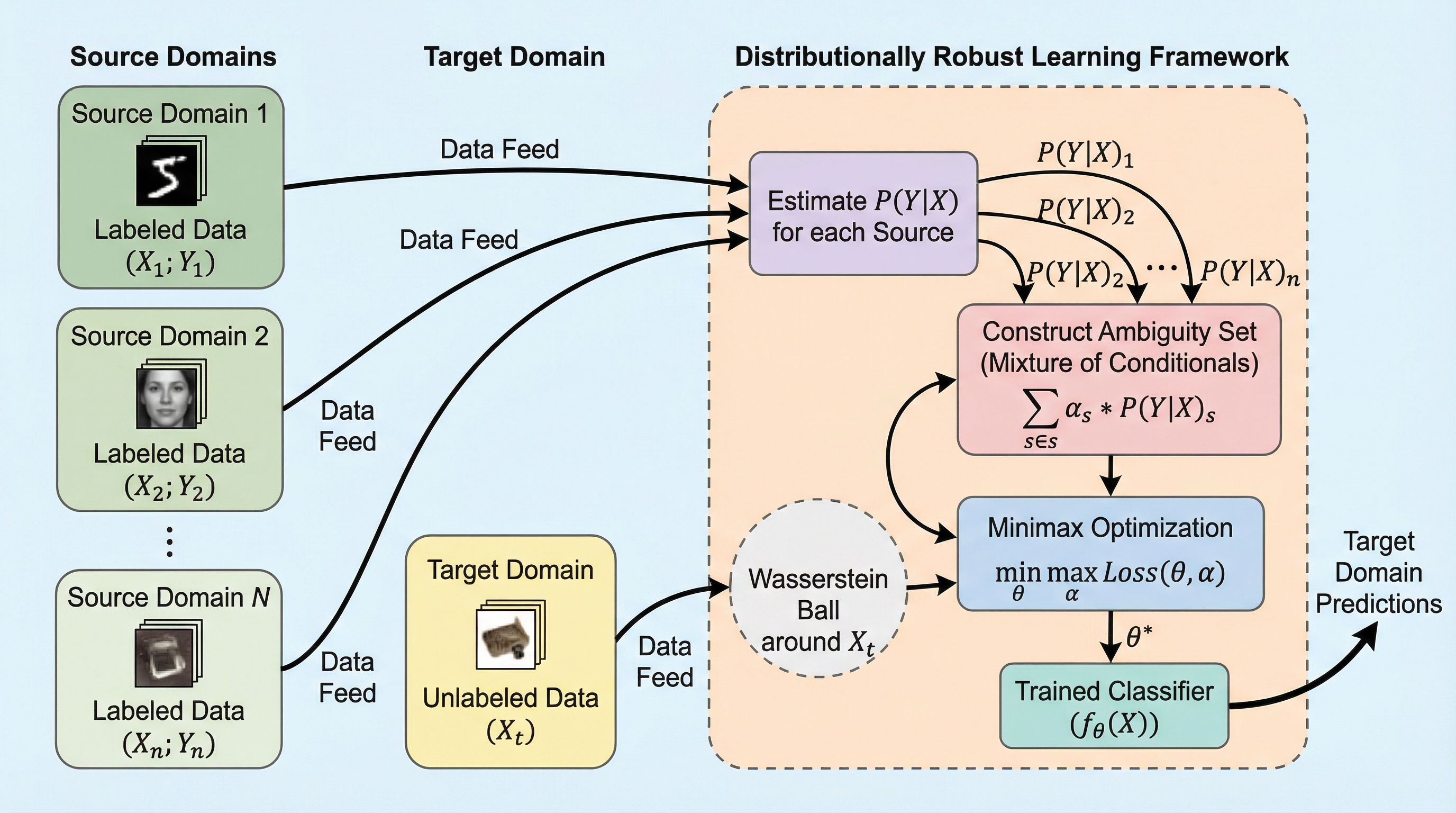 本研究が提案する核心的な解決策は、分類タスクに特化した新しい分布頑健学習(DRO)のフレームワークである。 この手法の最大の特徴は、標的ドメインにおける不確実性を「入力分布(共変量分布)」と「条件付きラベル分布」の両面から同時にモデル化する「曖昧さ集合(Ambiguity Set)」を導入した点にある。 具体的には、標的ドメインの条件付き分布が、複数のソースドメインから得られた条件付き分布の混合として表現可能であると仮定する。 この混合比率を柔軟に変化させることで、モデルはどのソースの情報をどの程度信頼すべきかを動的に判断し、最悪のシナリオにおいても高い精度を維持できるよう設計されている。…