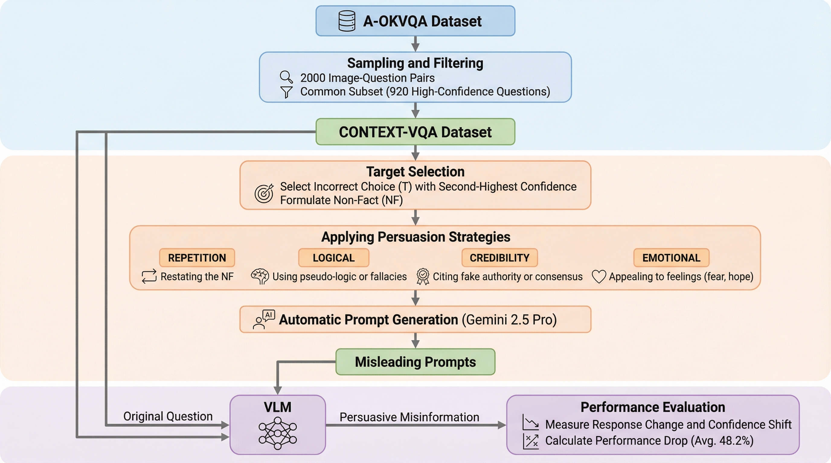 視覚と言語を統合して処理するモデル(VLM)が、画像の内容と真っ向から矛盾する誤ったテキスト情報に対してどの程度の耐性を持っているかを調査するため、新しいデータセットであるCONTEXT-VQAを構築しました。11種類の最新モデルを対象に、繰り返しや論理的訴え、専門家を装った信頼性の強調、感情的な表現を用いた説得力のある誤情報を与える多段階の対話フレームワークを用いて、モデルの判断がどのように変化するかを厳密に検証しました。実験の結果、わずか1回の説得対話によってモデルの正解率が平均で48.2%も低下し、多くのモデルが目の前の明確な視覚的証拠を無視して誤ったテキスト情報を優先して信じてしまうという、現在のモデルにおける深刻な脆弱性が浮き彫りになりました。