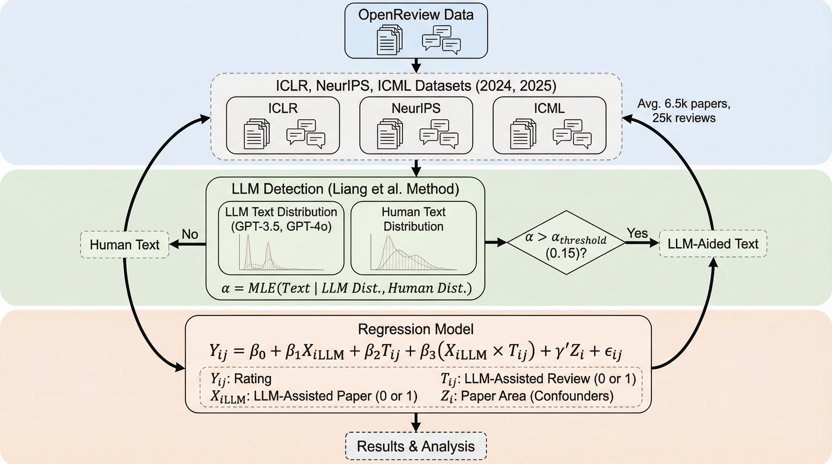 ChatGPTの登場以降、学術研究のワークフローにおいてLLM(大規模言語モデル)の導入が急速に進んでおり、現在では研究者の約81%が何らかの形でこれらのツールを業務に取り入れている。特に機械学習分野の主要な国際会議であるICLR、NeurIPS、ICMLにおいては、論文の執筆だけでなく査読プロセスにおいてもLLMの使用が疑われるケースが顕著に増加している。最新の統計データによれば、ICLRにおける査読文の約26.65%にLLMによる修正の痕跡が見られ、その割合はわずか1年でほぼ倍増するという急激な変化を遂げている。このような状況下で、研究コミュニティ内ではLLMが作成した査読の信頼性に対する懸念や、LLMが自身の出力特性に似た文章を好意的に評価する「自己強化バイアス」あるいは「自己愛的な偏り」への疑念が強まっている。 もしLLMを用いた査読がLLMを用いて書かれた論文を組織的に優遇するならば、学術的な公平性が根本から損なわれるだけでなく、著者が高い評価を得るためにLLMを悪用して文章を操作するという、評価システムのハッキングを助長するリスクも生じる。…