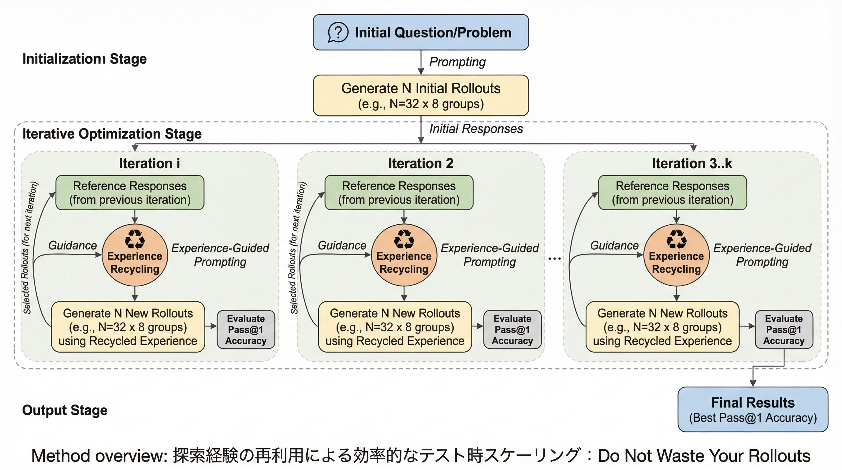 大規模言語モデルの推論能力を高めるテスト時スケーリングにおいて、従来の探索手法が各試行(ロールアウト)を使い捨てにしていた非効率性を指摘し、中間的な洞察を蓄積して再利用する「Recycling Search Experience(RSE)」を提案している。 RSEは、モデル自身の自己評価能力を活用して過去の試行から「肯定的な経験(検証済みの事実)」と「否定的な経験(失敗のパターン)」を抽出し、共有の経験バンクに保存することで、冗長な計算の省略と行き止まりの回避を可能にする。 数学的推論ベンチマークを用いた検証では、RSEは既存の強力なベースラインを同等の計算コストで一貫して上回り、特に小規模なモデルでも大規模モデルに匹敵する性能を引き出すなど、極めて高いスケーリング効率を実証した。
