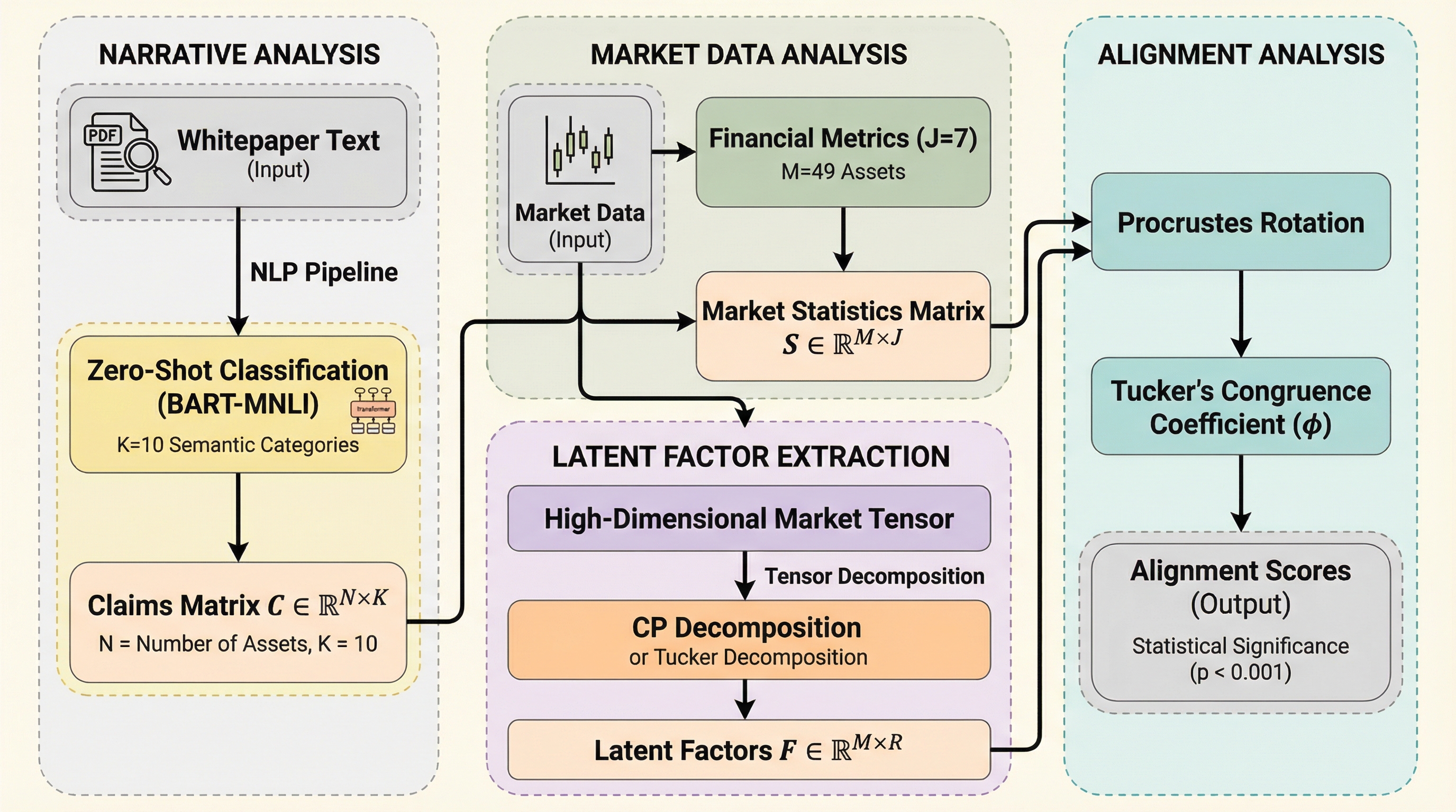 本研究は、自然言語処理(NLP)とテンソル分解を組み合わせた革新的な分析パイプラインを提案し、3つの異なる表現空間を構築してそれらの整合性を比較した。第一の空間は、24のホワイトペーパーを対象に、BART-MNLIを用いたゼロショット分類によって構築された「主張行列」である。ここでは、価値の保存、交換手段、スマートコントラクト、分散型金融(DeFi)、ガバナンス、スケーラビリティ、プライバシー、相互運用性、データストレージ、オラクルサービスの10のセマンティック・カテゴリーに対する各プロジェクトの注力度を数値化した。これにより、各資産がどのような機能的アイデンティティを主張しているかを定量的に捉えることが可能となった。第二の空間は、49の資産について2年間の時間枠で収集された1時間ごとのデータから算出された「市場統計行列」である。…