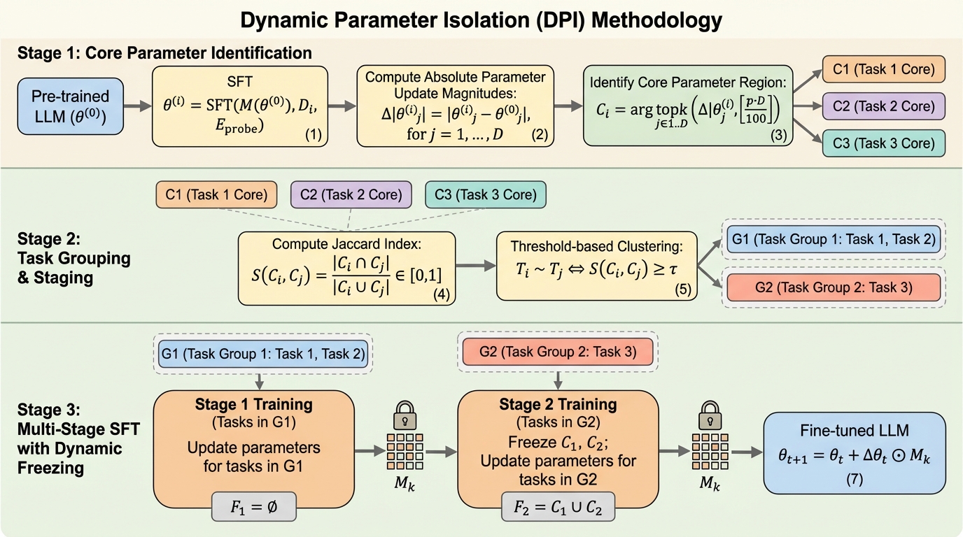 本論文では、タスク固有のパラメータ領域を分離・隔離することで、干渉のない微調整を実現する「動的パラメータ隔離(DPI:Dynamic Parameter Isolation)」という手法を提案している。この手法の核心は、LLMのパラメータがタスクごとに異なる役割を担っているという性質をデータ駆動型で特定し、それを動的に保護する点にある。DPIは、追加のパラメータを一切導入することなく、既存のモデルパラメータの更新を制御するだけで、マルチタスク学習における性能低下と破滅的忘却の両方に対処する。 DPIのプロセスは大きく分けて3つの段階で構成されている。まず第1段階では、各タスクにとって最も重要な「コアパラメータ領域」を特定する。…