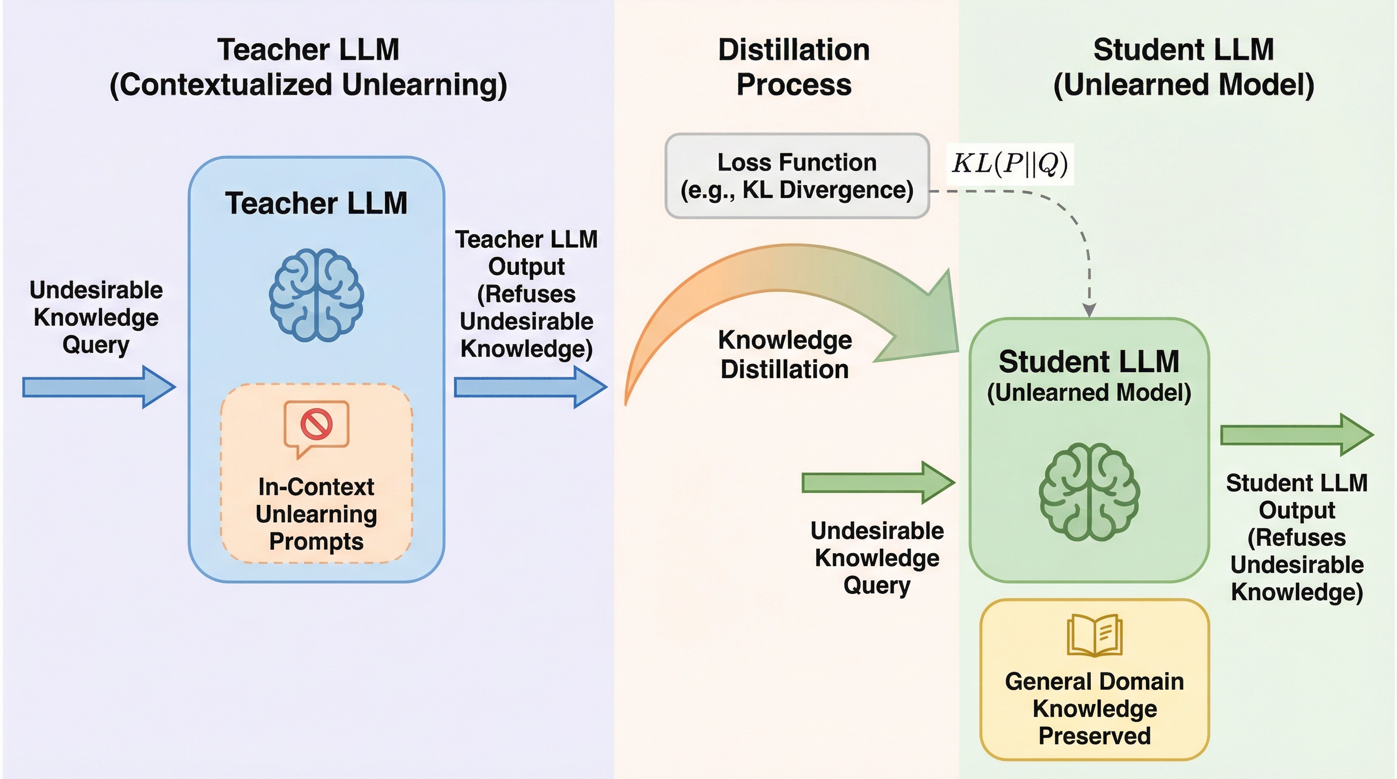 LLMから不適切な知識を削除するアンラーニングにおいて、従来の学習ベースの手法は計算負荷が高く汎用知識を失いやすい一方で、プロンプトによる手法は攻撃に弱いという課題がありました。本研究が提案するDUETは、プロンプトで制御された教師モデルの振る舞いを生徒モデルに蒸留することで、計算効率を維持しながら特定の知識を正確に削除し、かつモデルのパラメータに直接書き込むことで堅牢性を高めています。既存のベンチマークを用いた検証の結果、DUETは従来手法よりも大幅に少ないデータ量で高い忘却性能と知識保持能力を両立し、リバースエンジニアリング攻撃に対しても強い耐性を持つことが実証されました。