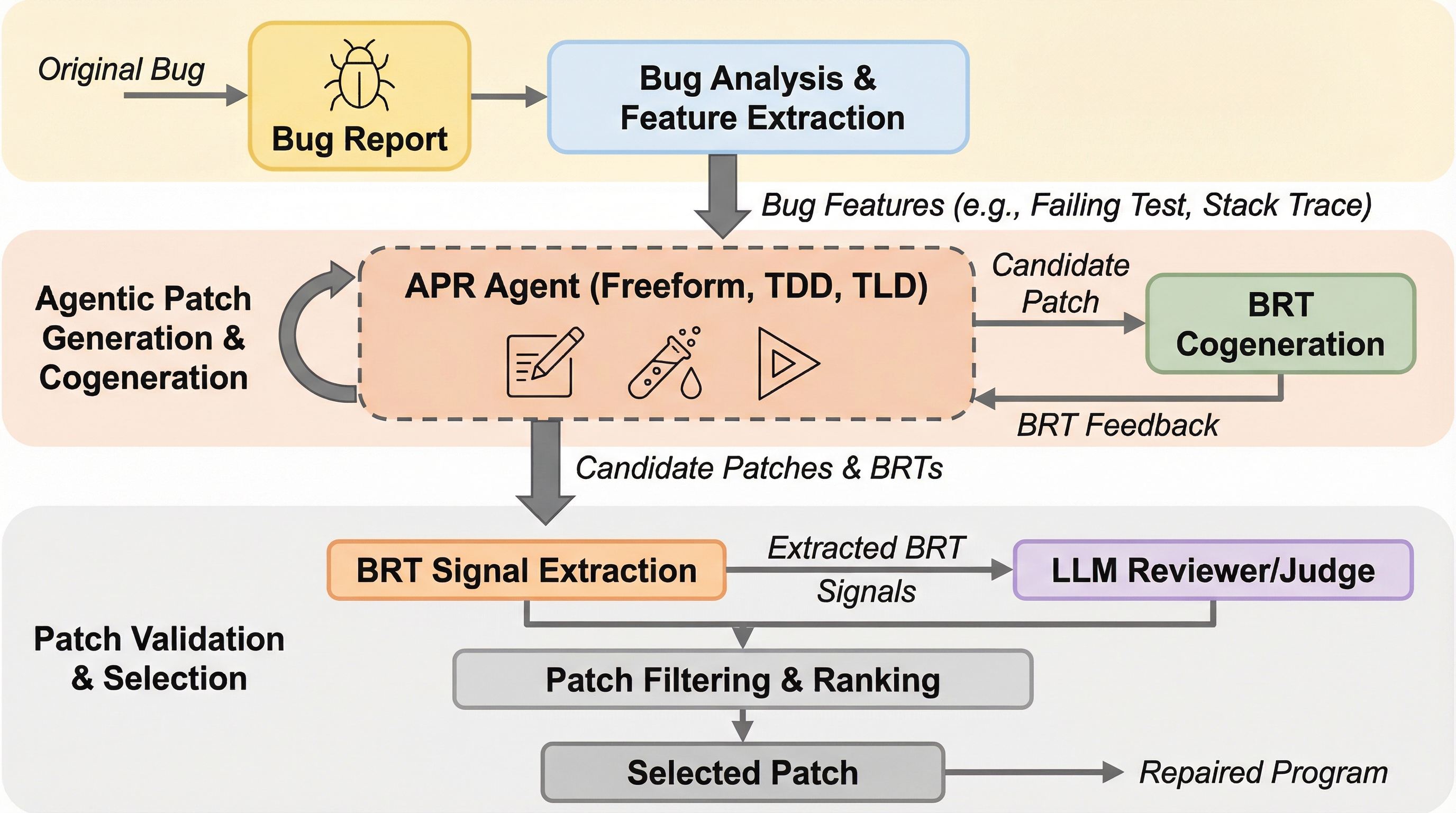 ソフトウェア開発において、バグ修正パッチを提出する際には、その修正が正しく機能することを証明し、将来の回帰を防ぐためのバグ再現テスト(BRT)を同時に実装することが一般的である。 Googleの実際の開発現場における調査では、ヌルポインタ例外(NPE)の修正パッチのうち、約39%にテストコードの変更が含まれていることが判明しており、人間による開発プロセスにおいてテストは不可欠な要素となっている。 しかし、既存のエージェント型自動プログラム修正(APR)システムの多くは、修正コードの生成とテストコードの生成を別々のパイプラインで行うか、あるいは修正コードのみを最終的な成果物として出力する傾向がある。 開発者はAIが生成した修正案をレビューする際、その修正が本当にバグを解決しているかを確認するために再現テストの存在を強く望んでおり、テストがないパッチは信頼性が低いと見なされることが多い。 また、修正とテストを個別に生成する場合、それぞれのタスクで共通して必要となる根本原因の分析などのコンテキストを再利用できず、計算リソースや調整のオーバーヘッドが発生するという課題がある。…