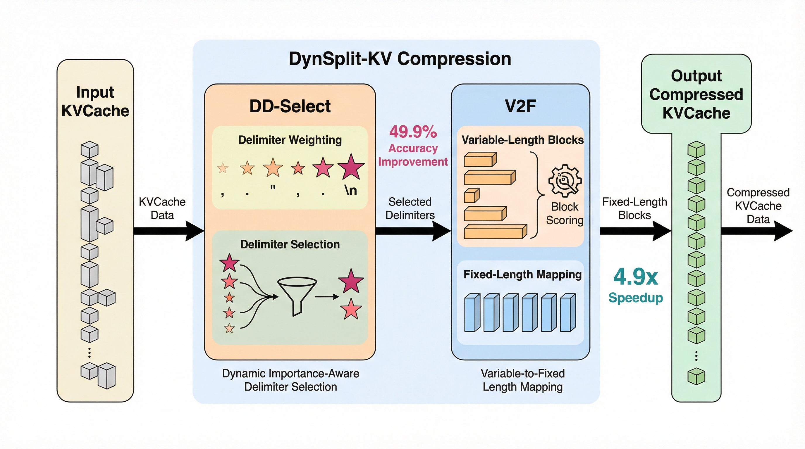 本研究では、KVキャッシュの圧縮において意味内容に合わせて動的に分割を行う新手法「DynSplit-KV」を提案しました。この手法の核心は、静的なルールに縛られるのではなく、モデル自身のアテンション機構を利用して、その時々の文脈においてどこが意味的な区切りとして重要であるかを判断する点にあります。DynSplit-KVは、従来の圧縮手法が抱えていた「意味の不一致による精度低下」と「可変長処理による計算オーバーヘッド」という2つの主要な課題を同時に解決することを目指しています。 具体的には、2つの革新的な戦略を導入しています。第一の戦略は「DD-Select(動的重要度認識区切り文字選択戦略)」です。…