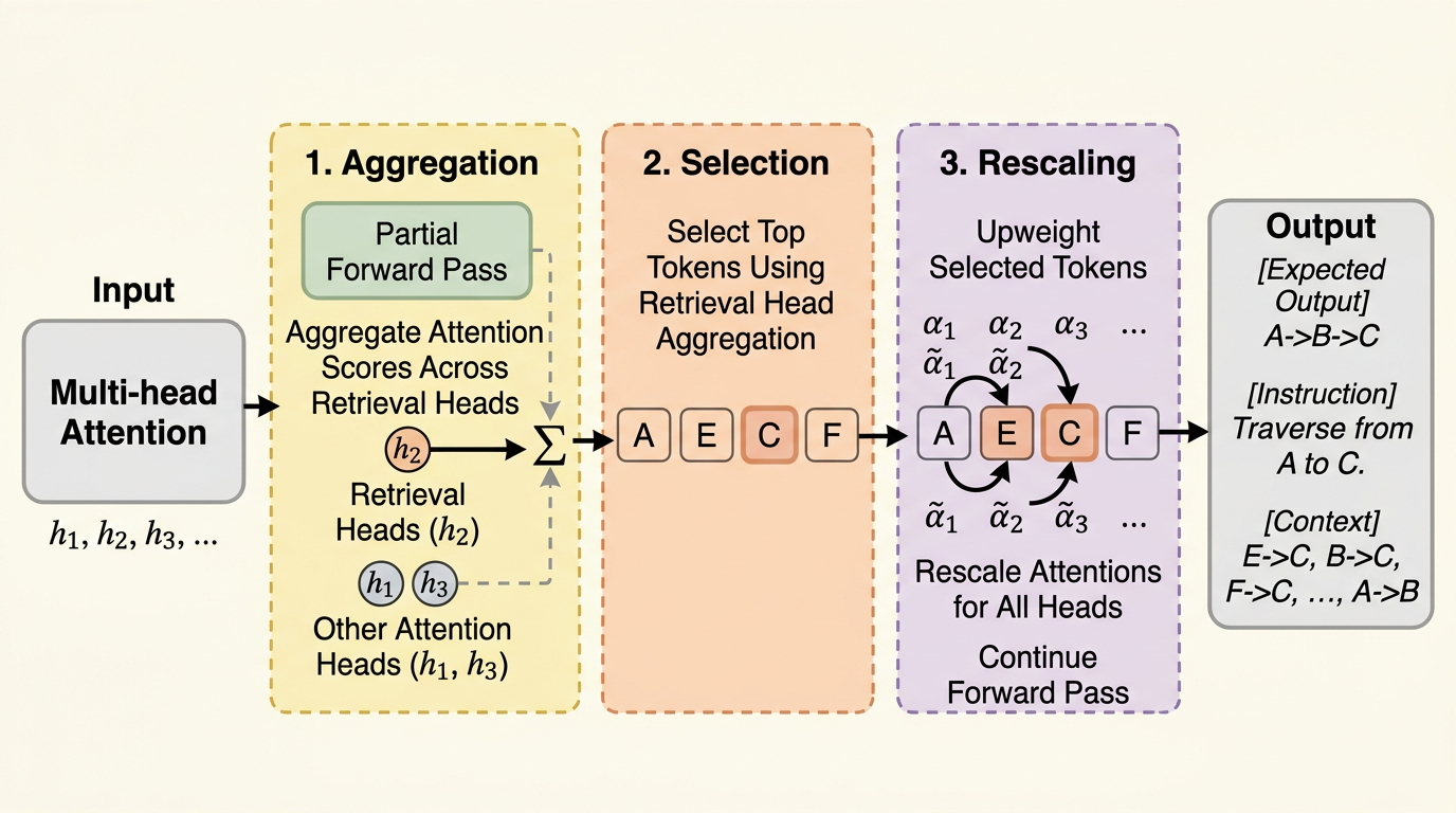 DySCO は、長文脈推論で精度が落ちる原因を「関連箇所への注意が生成途中で薄まること」と捉え、retrieval heads を使ってその時点で重要なトークンを見つけ、全ヘッドの注意を動的に増幅する推論時アルゴリズムです。 学習不要で既存モデルにそのまま適用でき、Qwen3-8B では 128K 文脈の MRCR と LongBenchV2 で YaRN 単独比最大 25% 相対改善、追加計算はおおむね 4% 程度に収まっています。 重要なのは、一律に attention を鋭くするのではなく、「今この生成ステップで必要な箇所だけ」を選んで強める点で、長文脈の精度改善を retrieval / compression とは別の軸で成立させたことです。