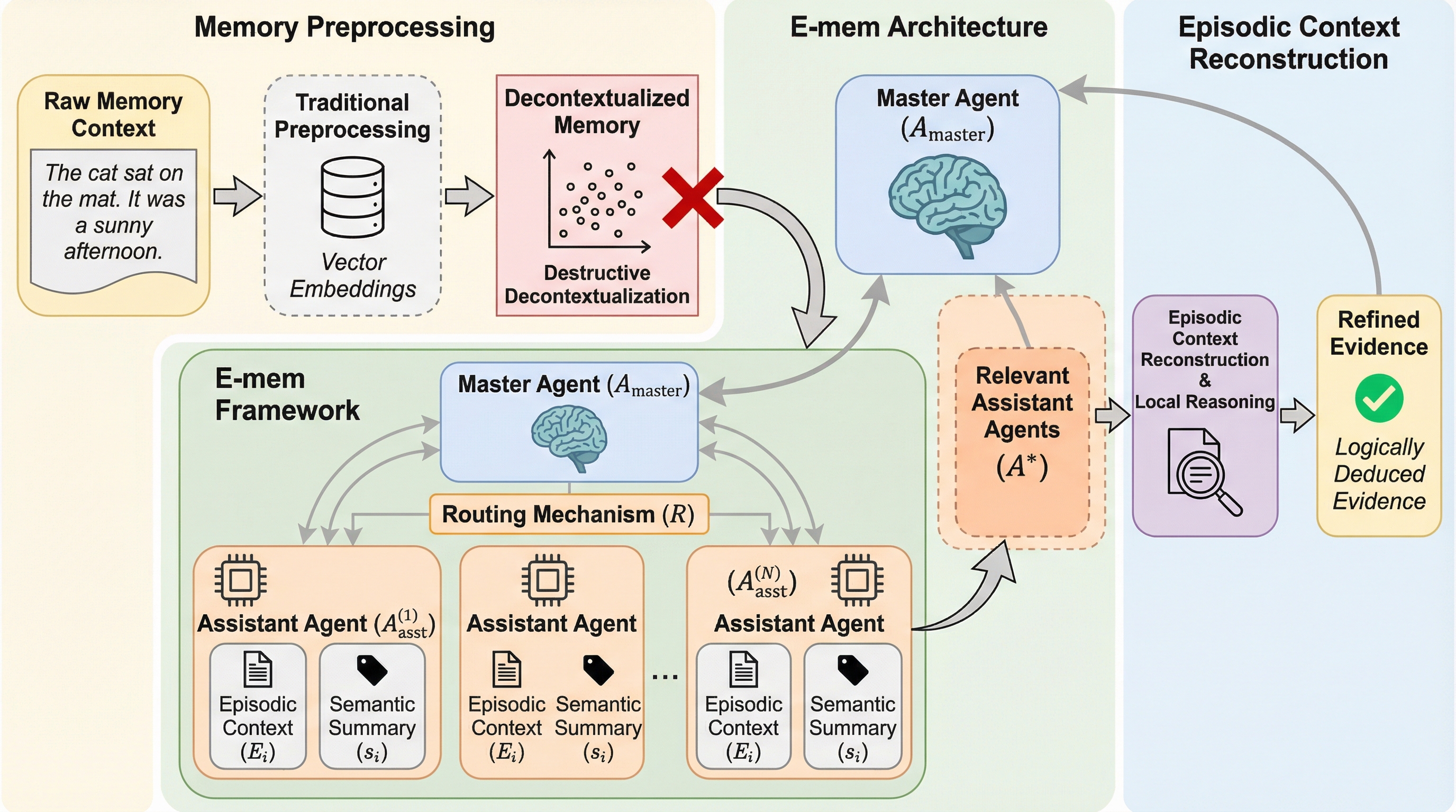本論文では、従来の「メモリ前処理」から「エピソード文脈再構成」へとパラダイムを転換する画期的なフレームワーク「E-mem」を提案しています。このアプローチは、生物学的な記憶の仕組みである「エングラム(記憶痕跡)」に強く触発されており、経験した内容を圧縮や変形を加えずに、そのまま「エピソード文脈」として保存することを基本原則としています。これにより、情報の劣化を根本から防ぎ、推論時に必要な文脈をありのままの形で復元することが可能になります。E-memの最大の特徴は、マスターエージェントと複数のアシスタントエージェントからなる、異種混合の階層型アーキテクチャを採用している点にあります。…