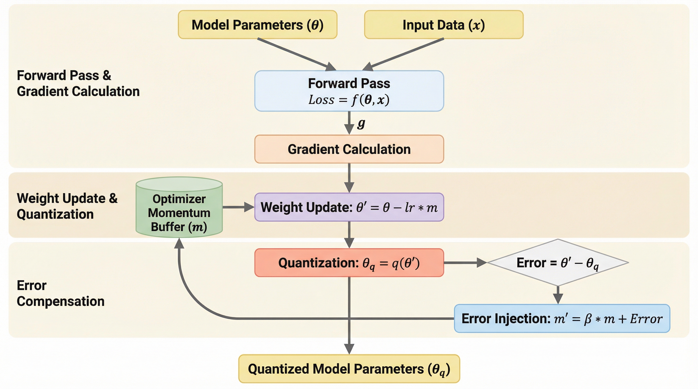 本研究では、フル精度のマスターウェイトを必要とせずに、正確な量子化トレーニングを可能にする「Error-Compensating Optimizer(ECO)」を提案しています。ECOの核心的なアイデアは、各レイヤーのパラメータを更新した直後に、その更新されたウェイトを量子化し、そこで発生した量子化誤差をオプティマイザのモーメンタムバッファに直接注入するというものです。これにより、現在のステップで失われた更新情報が次以降のステップへと持ち越され、累積的に補償される「エラーフィードバックループ」が形成されます。 この手法の最大の特徴は、追加のメモリを一切必要としない点にあります。通常、エラーフィードバックを実現するためには誤差を保持するための専用バッファが必要になりますが、ECOは既存のモーメンタムバッファを再利用することで、この問題を解決しました。…
