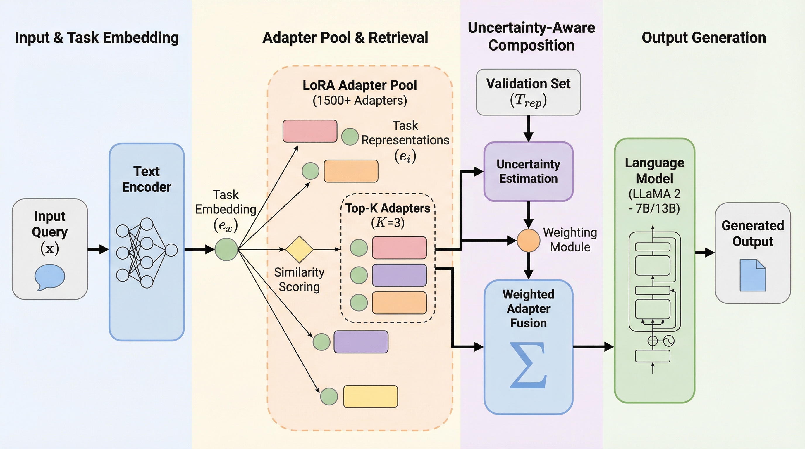 本研究では、LoRAアダプターのルーティングを「タスクレベル」で行う新しいトレーニングフリーのフレームワーク「LORAUTER」を提案しています。 LORAUTERの最大の特徴は、クエリを直接アダプターに結びつけるのではなく、まずクエリを意味的な「タスククラスター」にマッピングし、そのタスクに最適なアダプターを呼び出すという、タスク表現を介した仲介プロセスを導入した点にあります。 この設計により、アダプターの学習データが一切不要な「ブラックボックス」設定での運用が可能となり、プライバシーや機密性の観点からデータが提供されない公開アダプタープールでも柔軟に利用できるようになりました。…