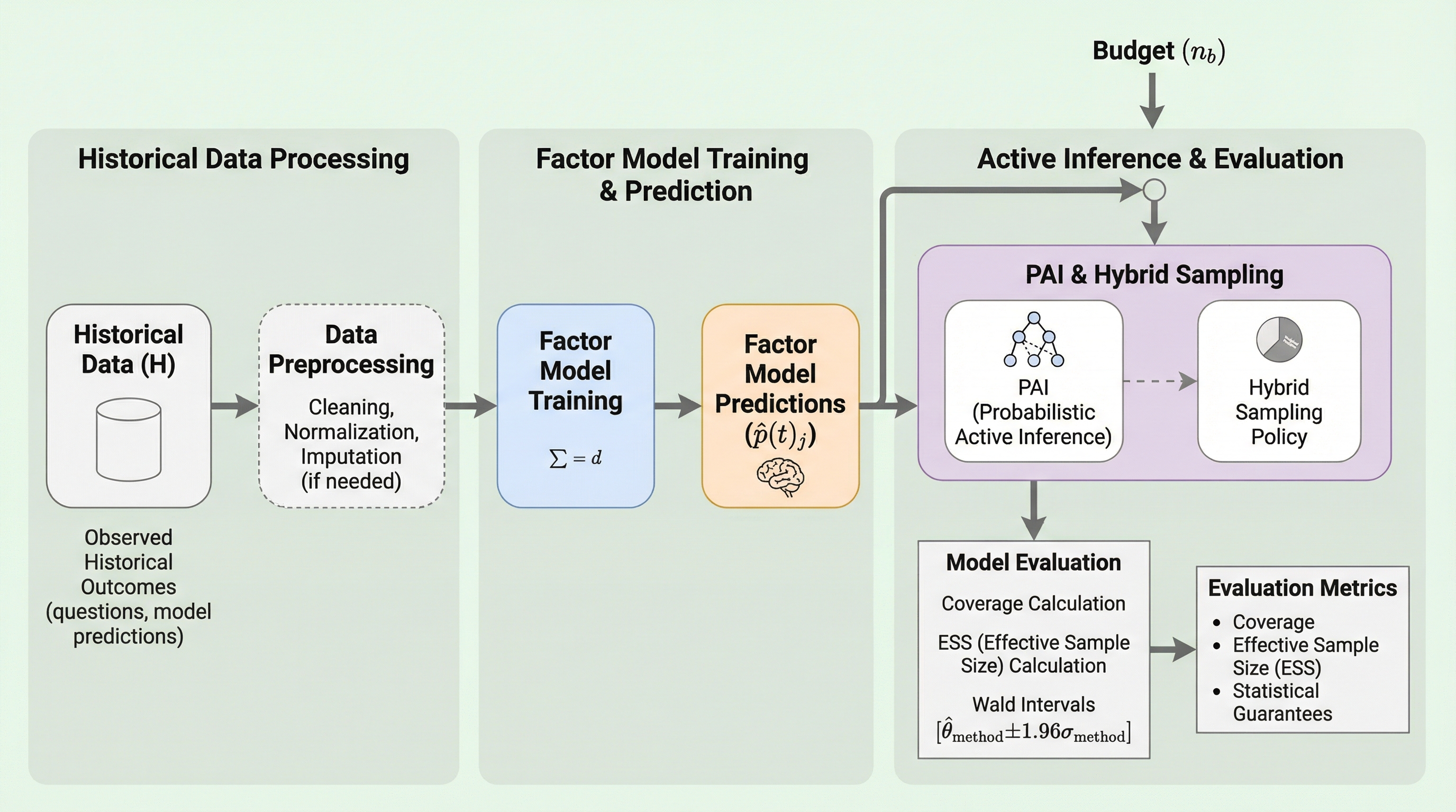本論文では、統計的保証を維持しながらLLM評価を効率化する革新的な手法として「FAQ(Factorized Active Querying)」を提案しています。FAQは、限られたクエリ予算の中で、モデルの正解率に対する信頼区間を可能な限り狭めることを目的としています。この手法の最大の特徴は、以下の3つの主要コンポーネントを統合した点にあります。 第一に、不完全な歴史的データから情報を抽出する「ベイズ因子モデル」です。過去に評価されたモデルと質問の正誤結果行列から、モデルの潜在的な能力と質問の特性を低次元の因子として学習します。これにより、新しいモデルが数問の質問に答えただけで、未回答の質問に対する正誤を確率的に予測することが可能になります。第二に、分散減少と能動学習を組み合わせた「ハイブリッドサンプリングポリシー」です。…