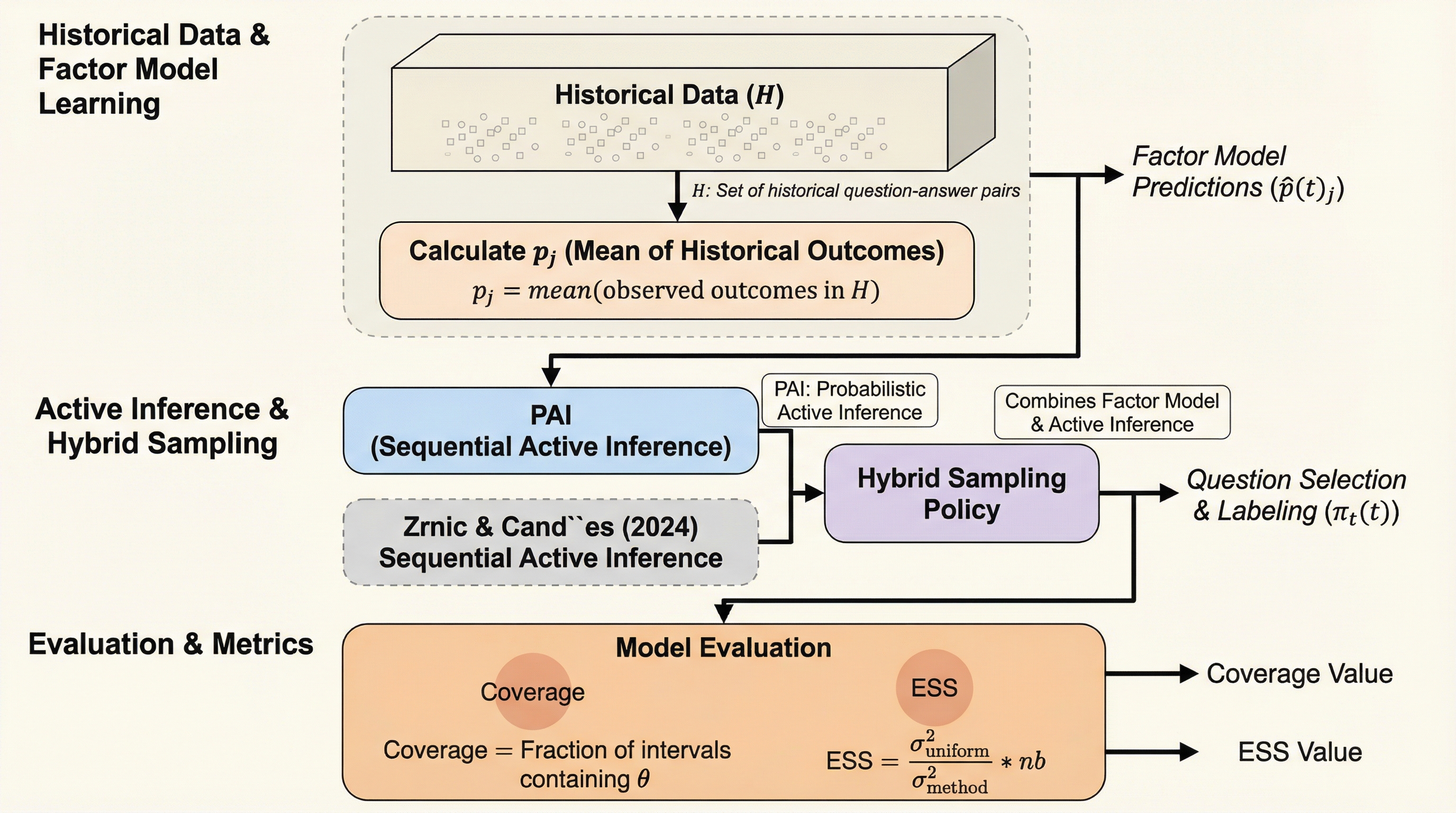 大規模言語モデル(LLM)の評価コストが急増する中、過去の評価データを活用して少ない質問数で高精度な性能推定を行う新手法「Factorized Active Querying (FAQ)」が開発されました。 この手法は、ベイズ因子モデルによる予測と能動的学習、さらに統計的妥当性を厳密に保証する「Proactive Active Inference (PAI)」を組み合わせることで、信頼区間の幅を維持したままクエリ数を最大5倍削減することに成功しています。 有限母集団に対する頻度主義的な被覆率を保証しており、APIコストや専門家による評価負荷を大幅に軽減しながら、モデルの正確な能力把握と迅速な意思決定を支援する画期的な枠組みとなっています。