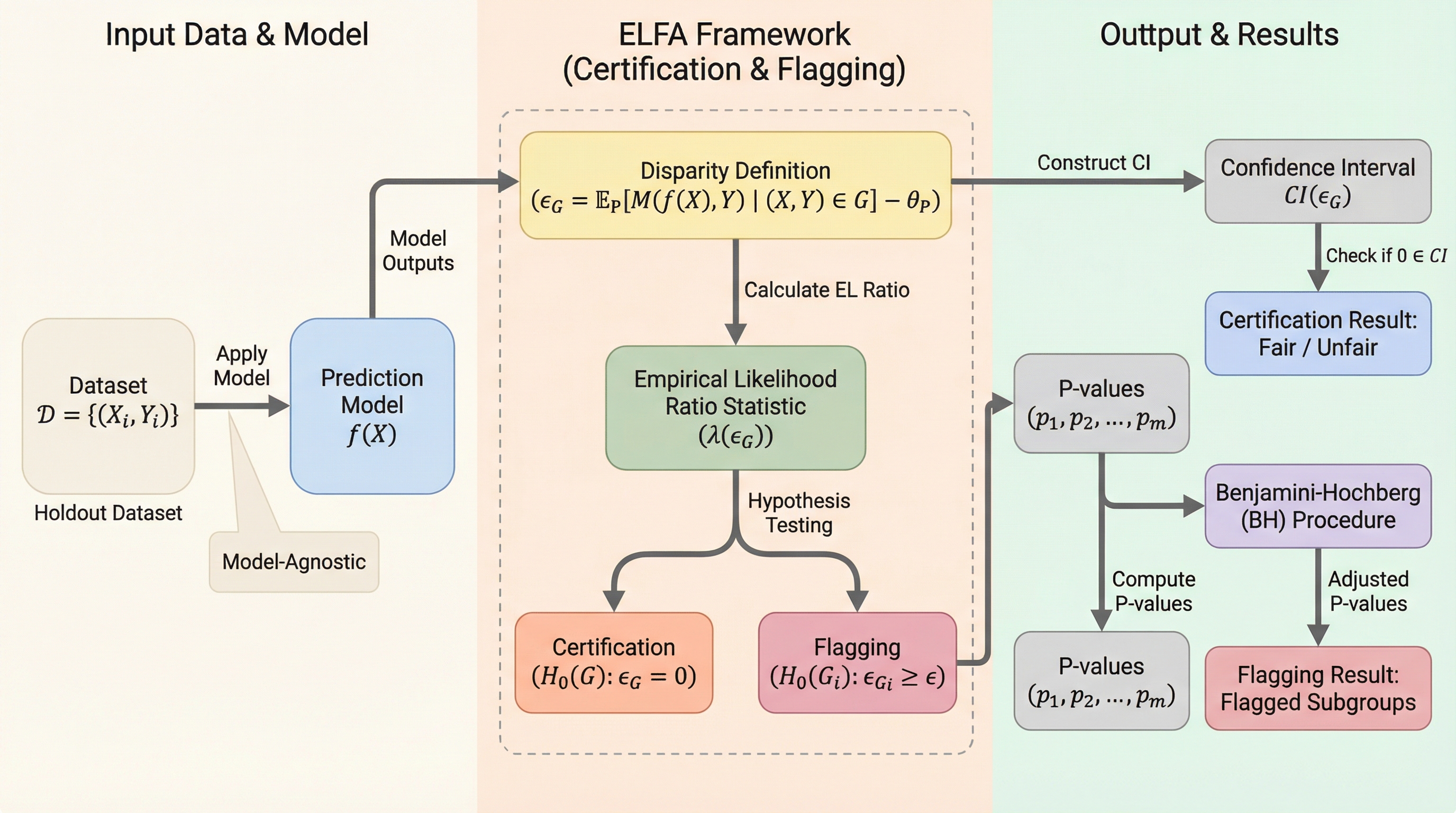 AIモデルのバイアスを検出するための新しい統計的枠組み「ELF A」を提案します。この手法は、データの背後にある分布を仮定しない非パラメトリックなアプローチであり、従来のブートストラップ法に比べて計算速度が数千倍から数万倍速く、統計的な正確性も高いという特徴があります。具体的には、特定の属性グループに対する予測の偏りを「認証(公平性の証明)」と「フラグ付け(不公平なグループの特定)」の2つの機能で厳密に評価し、交差的なバイアスも正確に検出可能です。