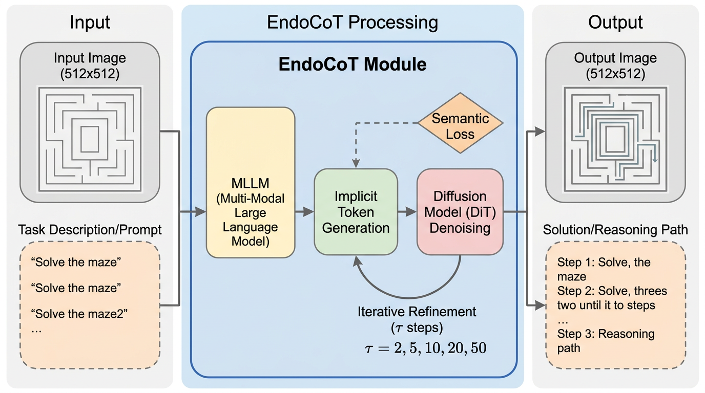 EndoCoT は、拡散モデルに組み込んだ MLLM の思考状態を一度きりで固定せず、潜在空間で反復更新しながら推論を深める枠組みです。 中心には iterative thought guidance module と terminal thought grounding module があり、途中の思考を深めつつ、最後は正解テキストへ接地させて推論軌跡を崩れにくくします。 Maze、TSP、VSP、Sudoku で平均精度 92.1% を達成し、最強ベースラインを 8.3 ポイント上回りました。難しい設定では Maze-32 で 90%、Sudoku-35 で 95% と、複雑化に強い点も目立ちます。