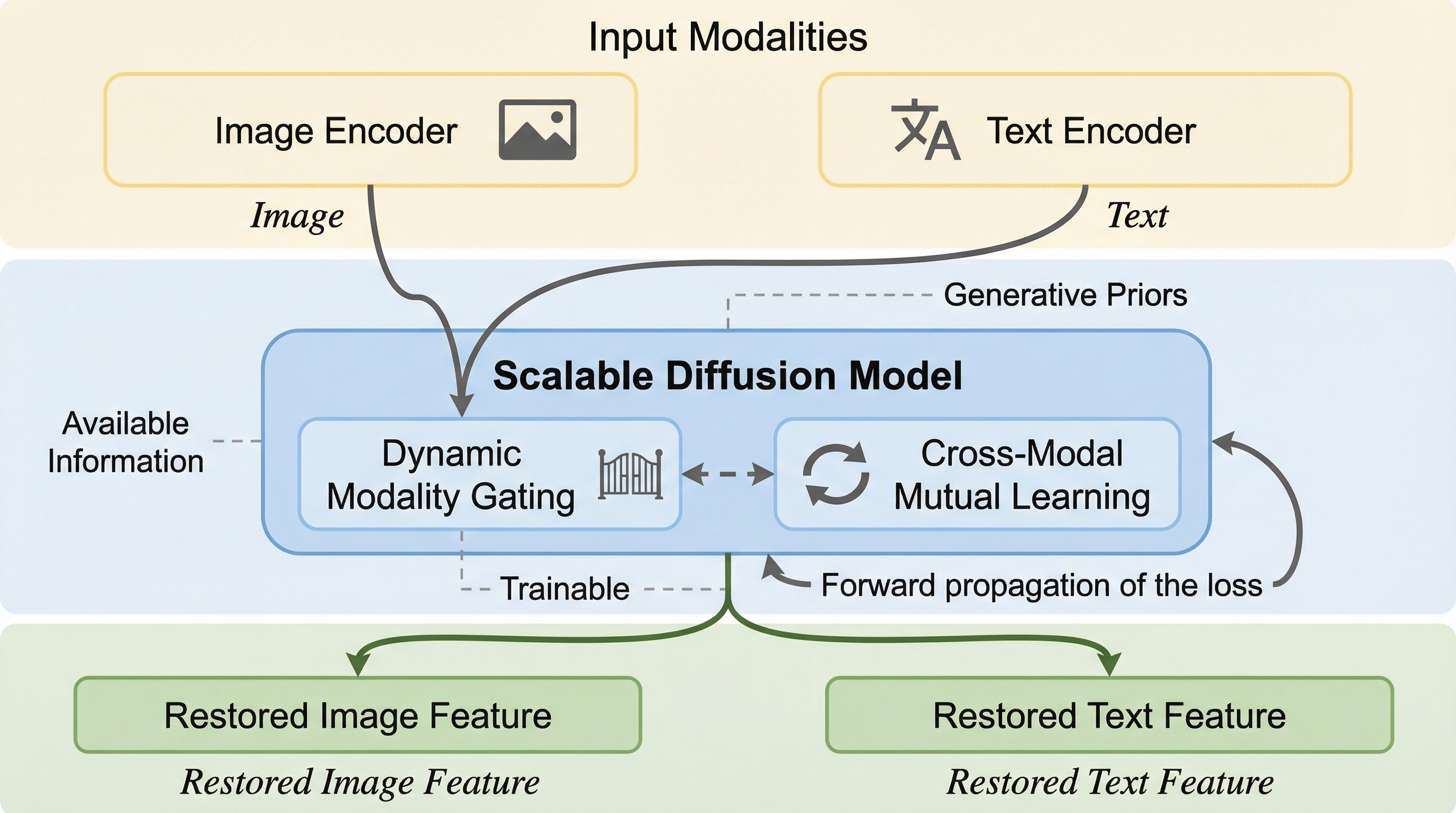 視覚と言語を統合する基盤モデル(VLM)は、推論時に画像やテキストのいずれかが欠損すると性能が著しく低下するという深刻な課題を抱えています。本研究はこの問題に対し、拡散モデルの強力な生成能力を活用して欠損した特徴を中間段階で復元する、既存のネットワークを凍結したままプラグインとして挿入可能な新しい学習戦略を提案しました。 提案手法には、利用可能な情報から意味的に一貫した特徴生成を導く「動的モダリティ・ゲーティング」と、画像とテキストの双方向で意味空間を整列させる「クロスモーダル相互学習」という二つの革新的な機構が導入されています。これにより、ノイズを抑制しながら失われた情報を高精度に補完し、単一モダリティ入力とマルチモーダル表現の間のギャップを効果的に埋めることが可能になりました。 4つの主要なベンチマークを用いたゼロショット評価において、既存のプロンプトベースや補完ベースの手法を全ての欠損シナリオで凌駕し、最高性能を達成しました。多様な欠損率や未知のデータセットに対しても高い堅牢性と汎用性を示すことが確認され、実世界のような不完全なデータ環境下での信頼性を飛躍的に高める、基盤モデルのための強力かつスケーラブルな拡張手法を確立しました。