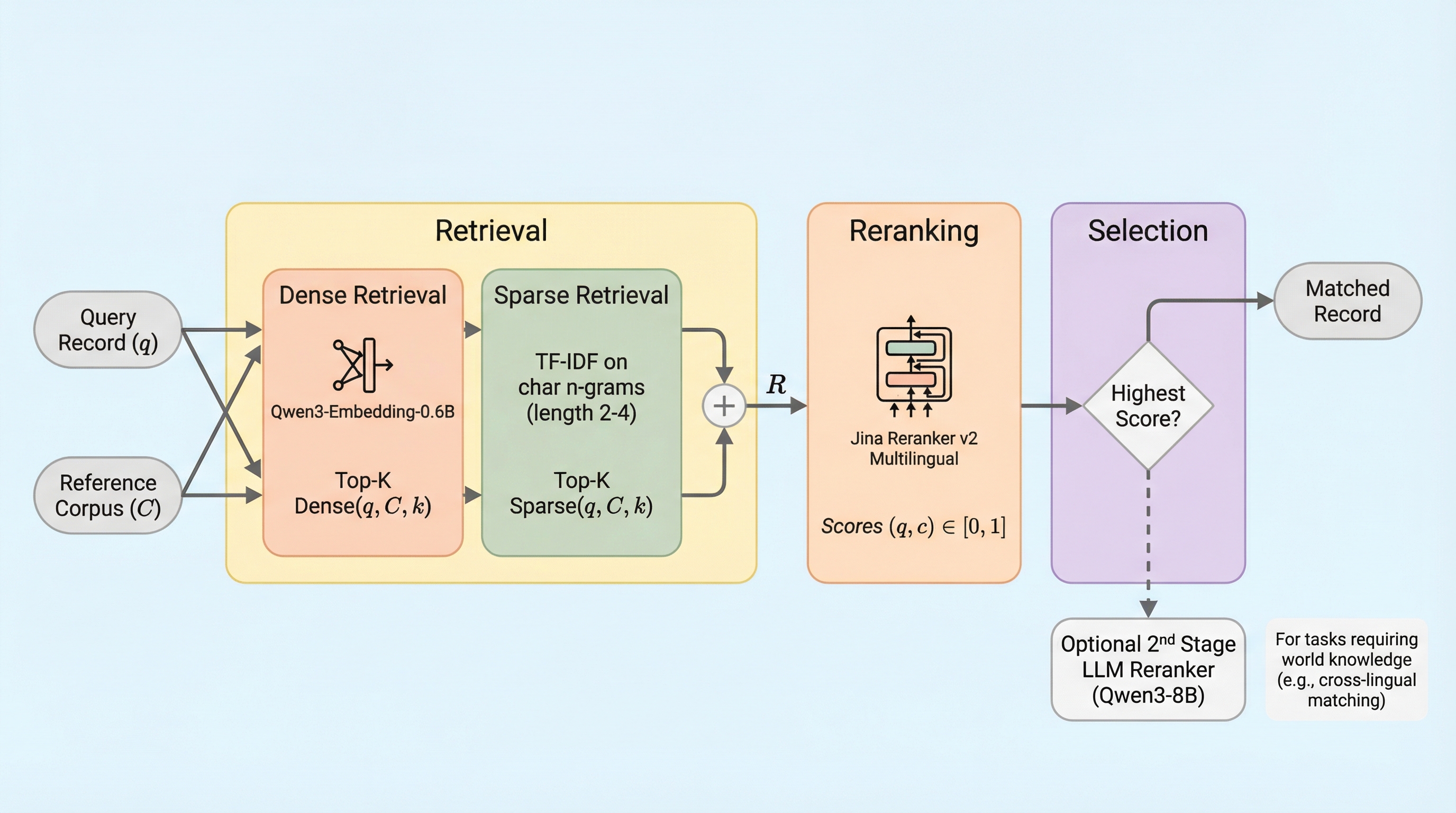 レコードリンケージは異なるデータセット間で同一の対象を照合する重要な工程だが、従来は場当たり的な規則や大量の学習データに依存しており、誤差の定量化も不十分であった。本論文が提案する「EnsembleLink」は、事前学習済み言語モデルのセマンティックな理解力を活用することで、学習データを一切使わずに、都市名や人名、組織名、多言語の政党名などの照合において教師あり学習手法と同等以上の高精度を達成した。 この手法は、密なベクトル検索と文字単位の疎な検索を組み合わせた候補抽出、およびクロスエンコーダによる高精度な再ランク付けという3段階のパイプラインで構成されており、オープンソースの軽量モデルを用いてローカル環境で実行できる。検証の結果、ニックネームや略称、非直訳の多言語対応など、従来のファジーマッチングでは困難だった複雑な照合を数分で完了させることが可能であり、社会科学などの実証研究におけるデータ統合の信頼性を大きく向上させる。 利用者は外部APIを呼び出すことなく、民生用ハードウェア上でプライバシーを保ちながら高速に処理を行うことができ、さらにモデルの重みが固定されているため結果の再現性も保証される。本手法は、都市名照合で90%、有権者照合で99%という極めて高い精度を記録しており、数千のラベルを必要とする既存の最先端手法に匹敵する性能をゼロショットで提供する画期的なツールである。
