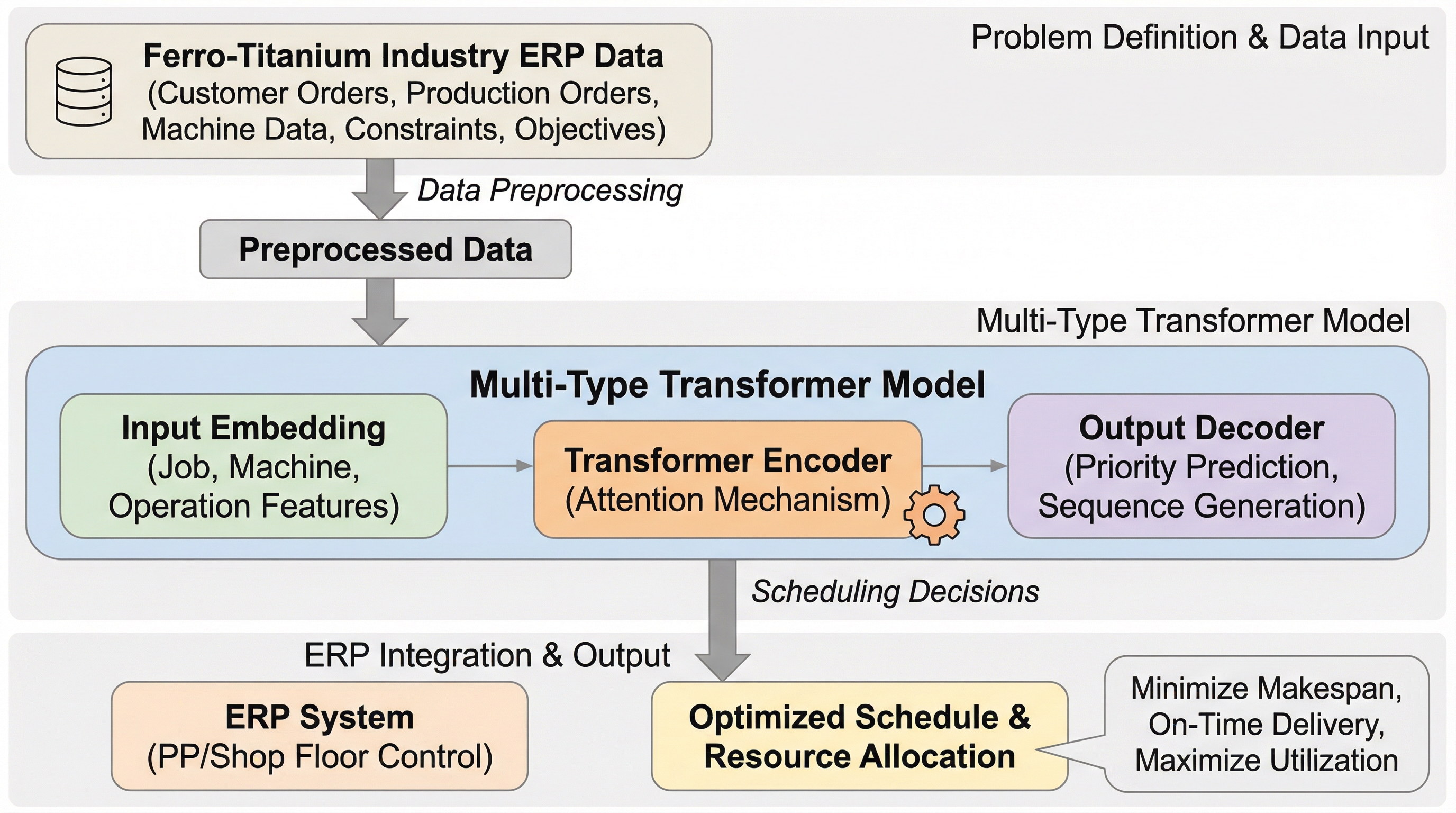 製造業の企業資源計画(ERP)において不可欠なジョブショップ・スケジューリング(JSP)やナップサック問題(KP)といった組合せ最適化に対し、複数のアテンション機構を統合した「マルチタイプTransformer(MTT)」を適用し、異なる構造を持つ課題を統一的に解決するフレームワークを構築しました。 本研究は、この高度なAIアーキテクチャを世界で初めてフェロチタン産業の実務プロセスに導入し、ナップサック問題で0.001、JSPで0.02という極めて微小な最適性ギャップを達成することで、従来の厳密解法に匹敵する精度と実用的な計算速度を両立できることを実証しました。 この成果により、調達から生産、物流に至る多岐にわたる最適化タスクを単一のニューラルネットワーク・バックボーンで管理することが可能となり、データの変動が激しい実際の製造現場において、柔軟かつ高効率な意思決定支援を実現する次世代のERPシステムの基盤を提示しました。