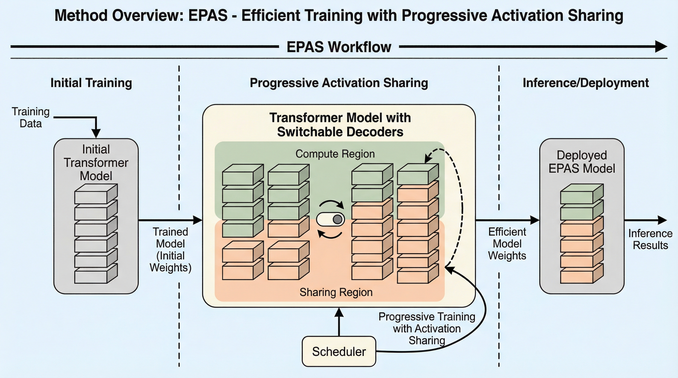 EPAS(Efficient training with Progressive Activation Sharing)は、Transformerモデルの深層における計算の冗長性を利用し、学習中に活性化(QKまたはKV)の共有領域を段階的に拡大させることで、学習と推論の両方の効率を飛躍的に向上させる新しい学習フレームワークである。 スイッチ切り替え可能なデコーダー層を導入し、学習の進行に合わせて深い層から浅い層へと共有範囲を広げる決定論的なスケジューリングを行うことで、モデルの精度を維持しながら学習スループットを最大11.1%、推論スループットを最大29.2%向上させることに成功した。 LLaMAモデルを用いた検証では、複雑な知識蒸留を必要とせずに既存の事前学習済みモデルを効率的な共有モデルへと変換可能であり、計算リソースや遅延の制約に応じて推論時の共有構成を柔軟に変更できるMany-in-oneモデルとしての実用的な特性を実証した。