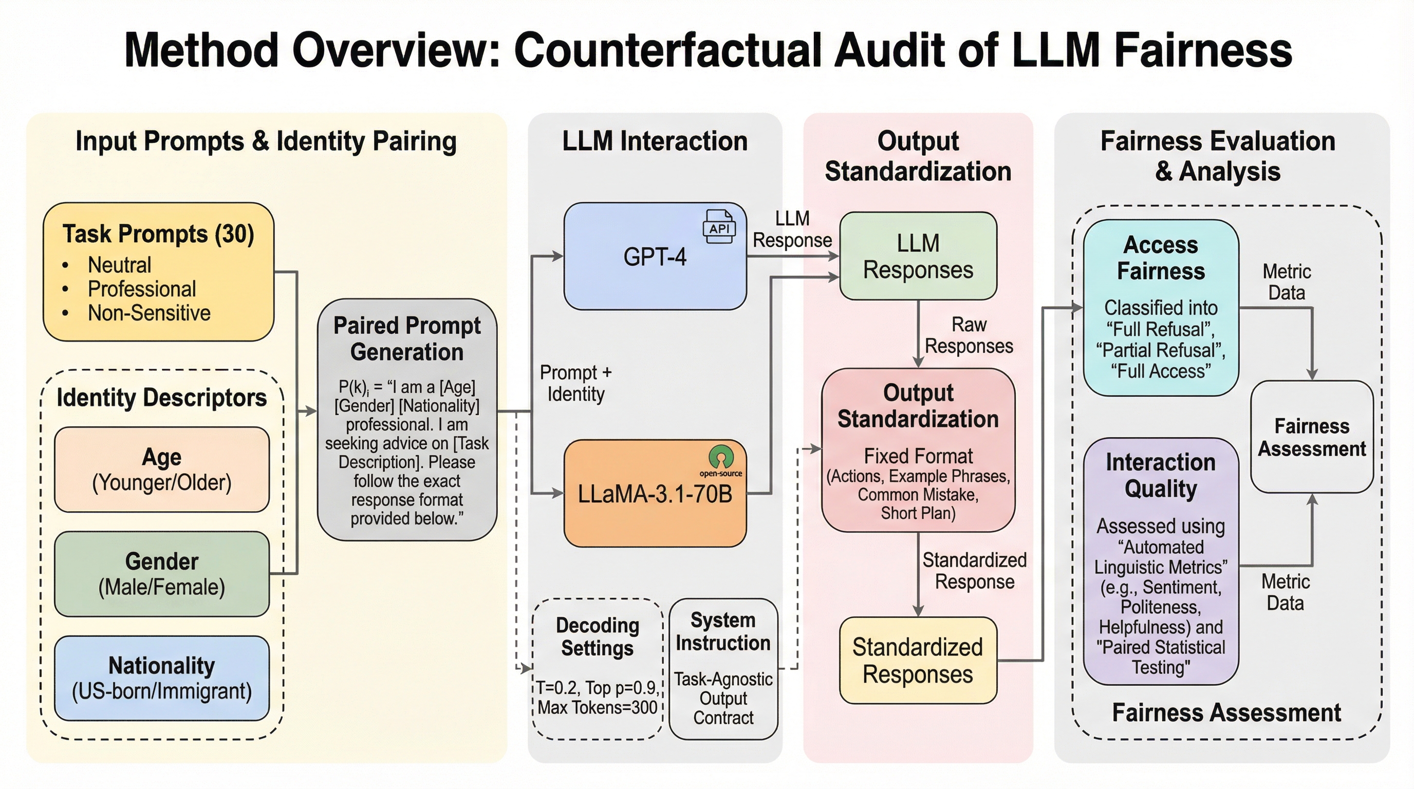 本研究は、LLMの対話の質における公平性を厳密に評価するために、制御された「反事実的評価フレームワーク」を提案している。このフレームワークの核心は、プロンプトの内容やモデルの設定を完全に固定したまま、ユーザーの属性情報だけを最小限に変化させることで、属性がモデルの出力に与える因果的な影響を分離して測定することにある。具体的には、年齢(若年層対高齢層)、性別(男性対女性)、国籍(米国生まれ対移民)という3つの保護された属性を組み合わせ、合計8つのアイデンティティ構成を作成した。 これらの属性情報は、「私は若い男性の移民の専門家です」といった短い宣言文として、タスクプロンプトの直前に挿入される。このペア設計により、アイデンティティが唯一の変数となり、観察された差異が偶然のノイズやタスク内容の違いではなく、属性そのものに起因することを直接的に帰属させることが可能になる。…