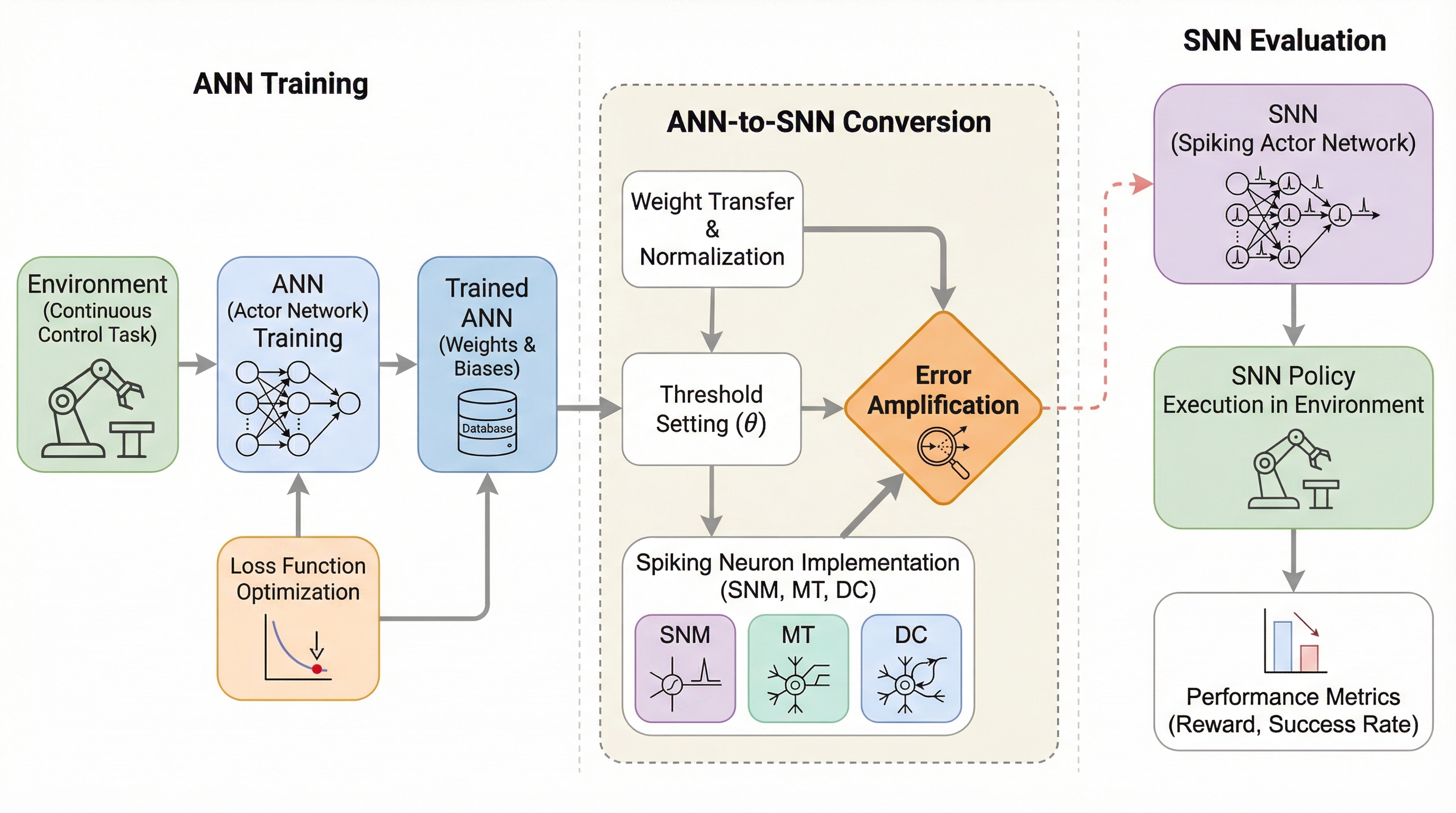 学習済みANNをSNNへ変換する手法は、連続制御タスクにおいて性能が著しく低下するが、その主因が微小な行動誤差の累積による「状態分布の乖離」と、誤差が時間的に正の相関を持つ「誤差増幅」にあることを突き止めた。
