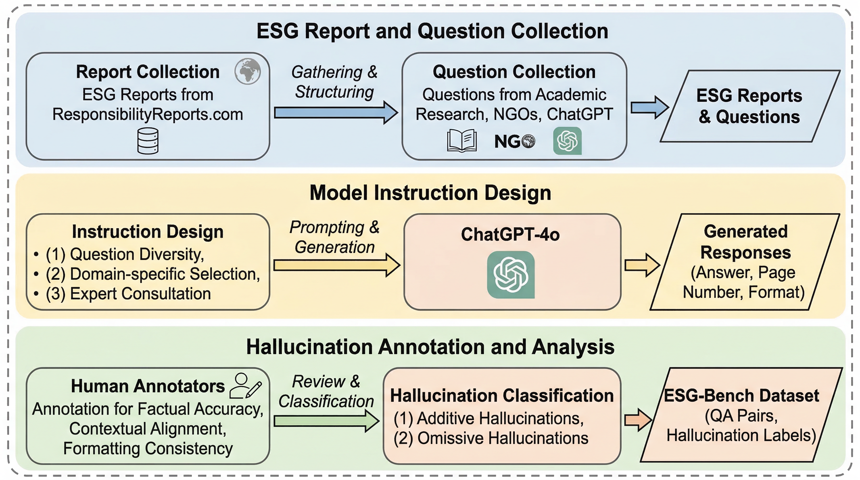 提案は大きく二つです。第一に、ESG-Bench という hallucination-aware ESG QA ベンチマークを構築しています。ここでは実在の ESG レポートを対象に、質問、回答、根拠、そして hallucination の有無を人手で注釈しています。しかも単に正答率を見るのではなく、回答が存在するケースと、文書中に十分な根拠がなく「not provided」と答えるべきケースを分けて扱います。