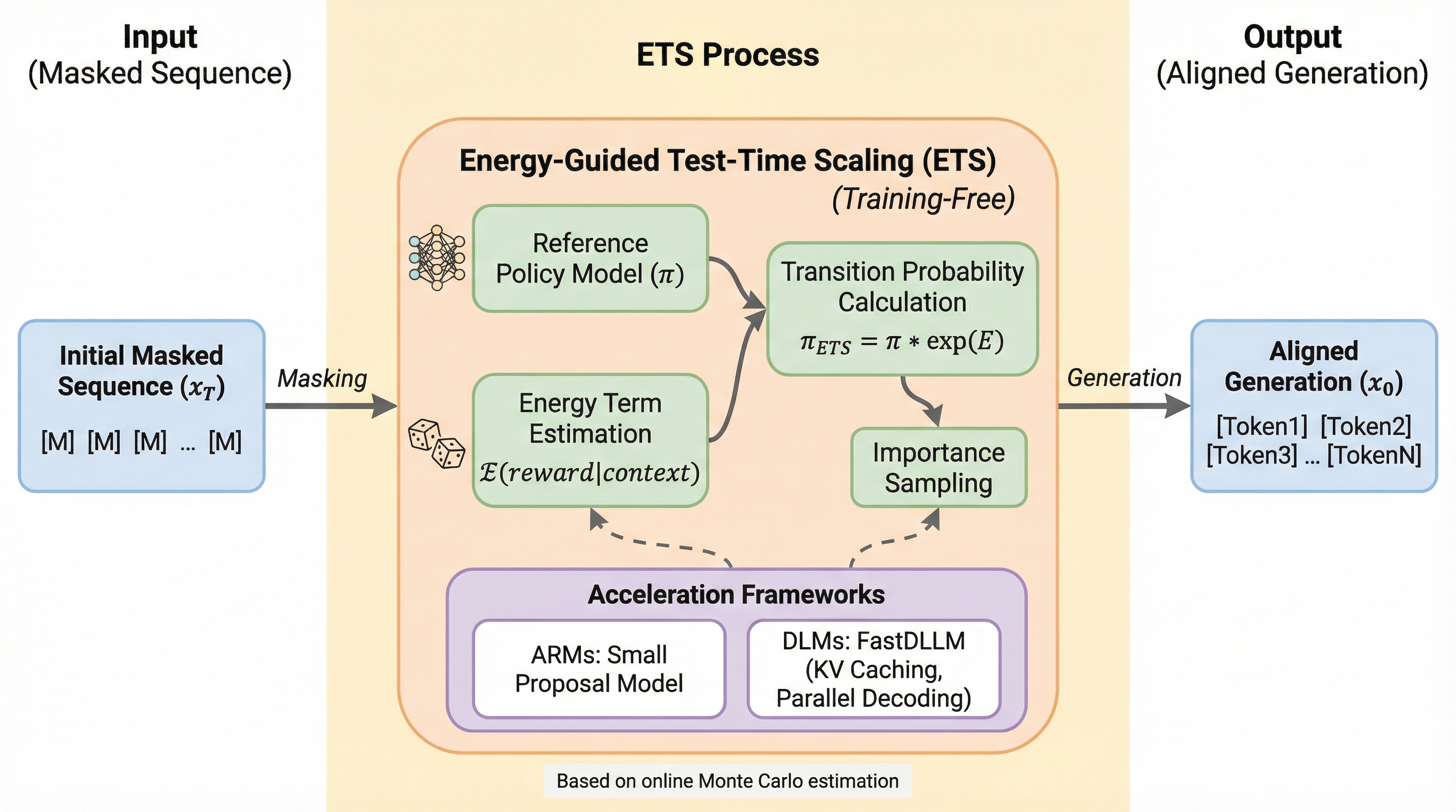 言語モデルの強化学習(RL)による事後学習アライメントは、複雑なトレーニングプロセスや高コストな報酬モデリング、不安定な学習動態といった課題を抱えていますが、本研究では追加の学習を一切行わずに推論時に最適なRLポリシーから直接サンプリングを行う手法「Energy-Guided Test-Time Scaling(ETS)」を提案しています。 ETSは、マスク言語モデリング(MLM)の枠組みにおいて遷移確率をリファレンスポリシーとエネルギー項に分解し、オンラインモンテカルロ法を用いてこのエネルギー項を推定することで、学習なしでのアライメントを実現し、推論時の計算量を増やすことで生成品質を向上させる新しいテスト時スケーリングの形態を提示しています。 実用的な効率を確保するために、重点サンプリングと軽量なプロポーザルモデルを組み合わせた加速戦略を導入しており、理論的な収束性を保証しながら推論の遅延を大幅に削減し、推論やコーディングなどのベンチマークにおいて従来の学習ベースのRL手法を凌駕する性能を一貫して達成していることが確認されました。