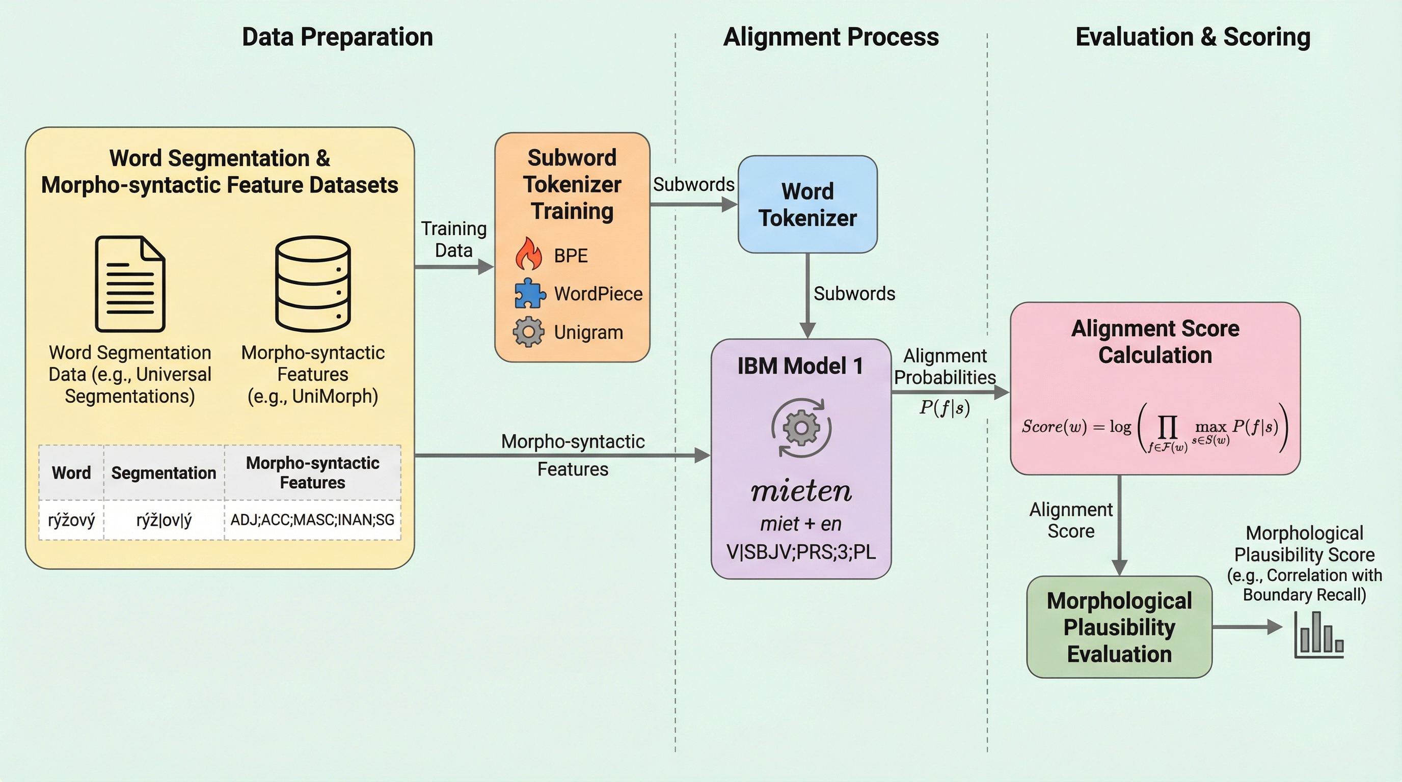 我々は、サブワード分割の形態論的妥当性を評価するための新しい指標を提案する。多くの言語で入手不可能であったり品質が不均一であったりする正解分割データを必要とする、一般的に用いられる形態素境界や検索のF値とは異なり、本手法は形態統語的特徴を利用する。これらは、ユニバーサル・ディペンデンシーズやユニモーフなどのリソースにおいて、より広範な言語で利用可能である。この指標は、IBMモデル1を通じてサブワードと形態論的特徴を確率的に対応付けることで機能する。実験の結果、本指標は従来の形態素境界の再現率と良好な相関を示しつつ、異なる形態体系を持つ言語間でもより広く適用可能であることが示された。 現代の自然言語処理システムにおいて、サブワードトークン化はテキストを処理可能な単位に分割するための極めて重要な前処理ステップとなっている。しかし、トークナイザーが形態論的にどれほど妥当な分割を行っているかを正確に評価することは、依然として解決すべき大きな課題である。従来の評価手法では、言語学者が作成した正解の形態素分割データ、いわゆるゴールドスタンダードとの比較に基づいた、境界の再現率やF1スコアが一般的に用いられてきた。…