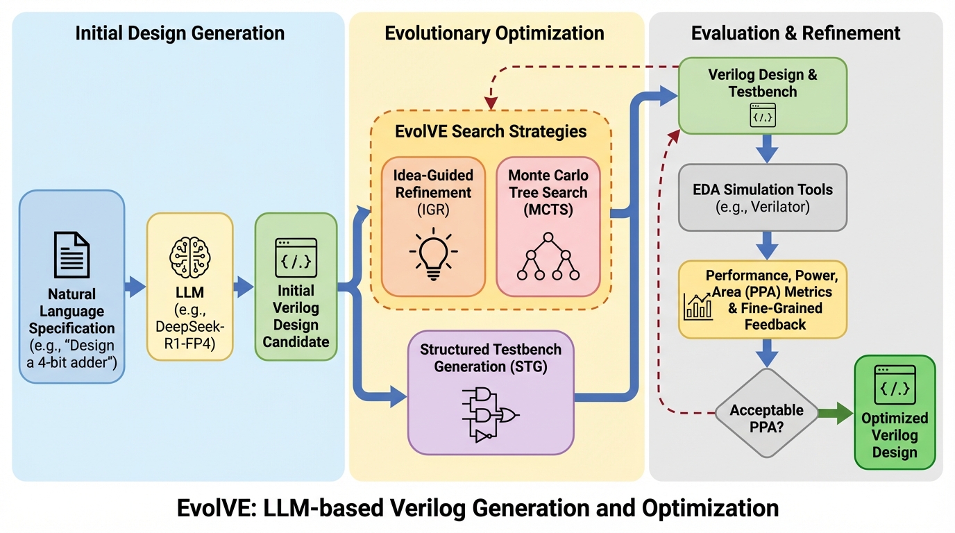 EvolVEは、大規模言語モデル(LLM)を活用してハードウェア記述言語であるVerilogのコード生成と最適化を自動化する、進化的探索アルゴリズムに基づいた革新的なフレームワークである。 機能的正当性を最大化するモンテカルロ木探索(MCTS)と、設計の最適化に特化したアイデア主導型洗練(IGR)という二つの異なる戦略を使い分け、さらに検証プロセスを高速化する構造化テストベンチ生成(STG)を導入している。 評価の結果、既存のベンチマークで世界最高水準の正解率を達成しただけでなく、産業規模の課題を含むIC-RTLベンチマークにおいて、人間による設計を大幅に上回る電力・性能・面積(PPA)の削減に成功した。