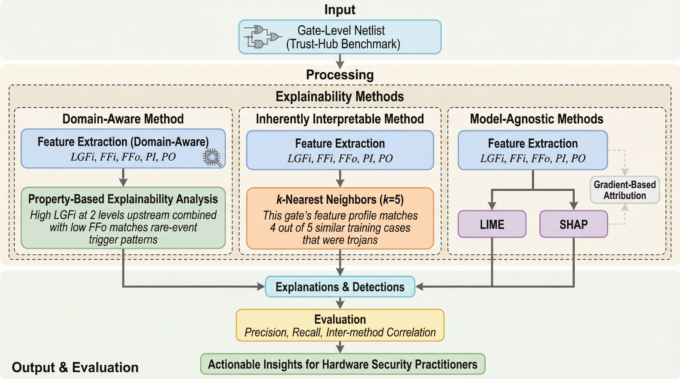 本研究は、ゲートレベルでのハードウェア・トロイの木馬検出において、ドメイン知識を活用した属性分析、事例ベース推論、モデル非依存の重要度算出という3つの説明可能AI(XAI)手法を系統的に比較し、実務的な有用性を検証しました。