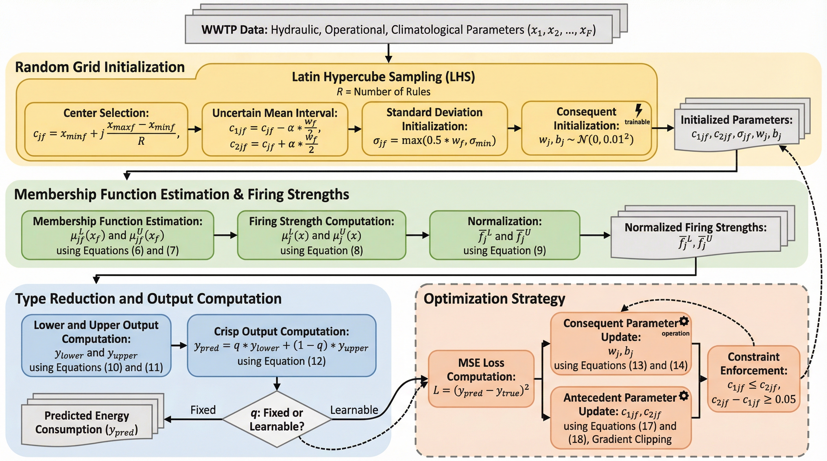 本研究の核心は、下水処理施設の電力消費予測において、単なる数値の予測に留まらず、その背後にある不確実性を人間が理解可能な形式で分解して提示する、3層構造の説明可能なフレームワークを提案した点にあります。このシステムの中心を担うのは、インターバル・タイプ2・アダプティブ・ニューロファジィ推論システム(IT2-ANFIS)です。従来のタイプ1・ファジィ論理は、ある値が集合に属するかどうかを0から1の確定的な値で表現しますが、提案手法であるタイプ2・ファジィ集合は、そのメンバーシップ関数自体に不確実性を持たせています。…