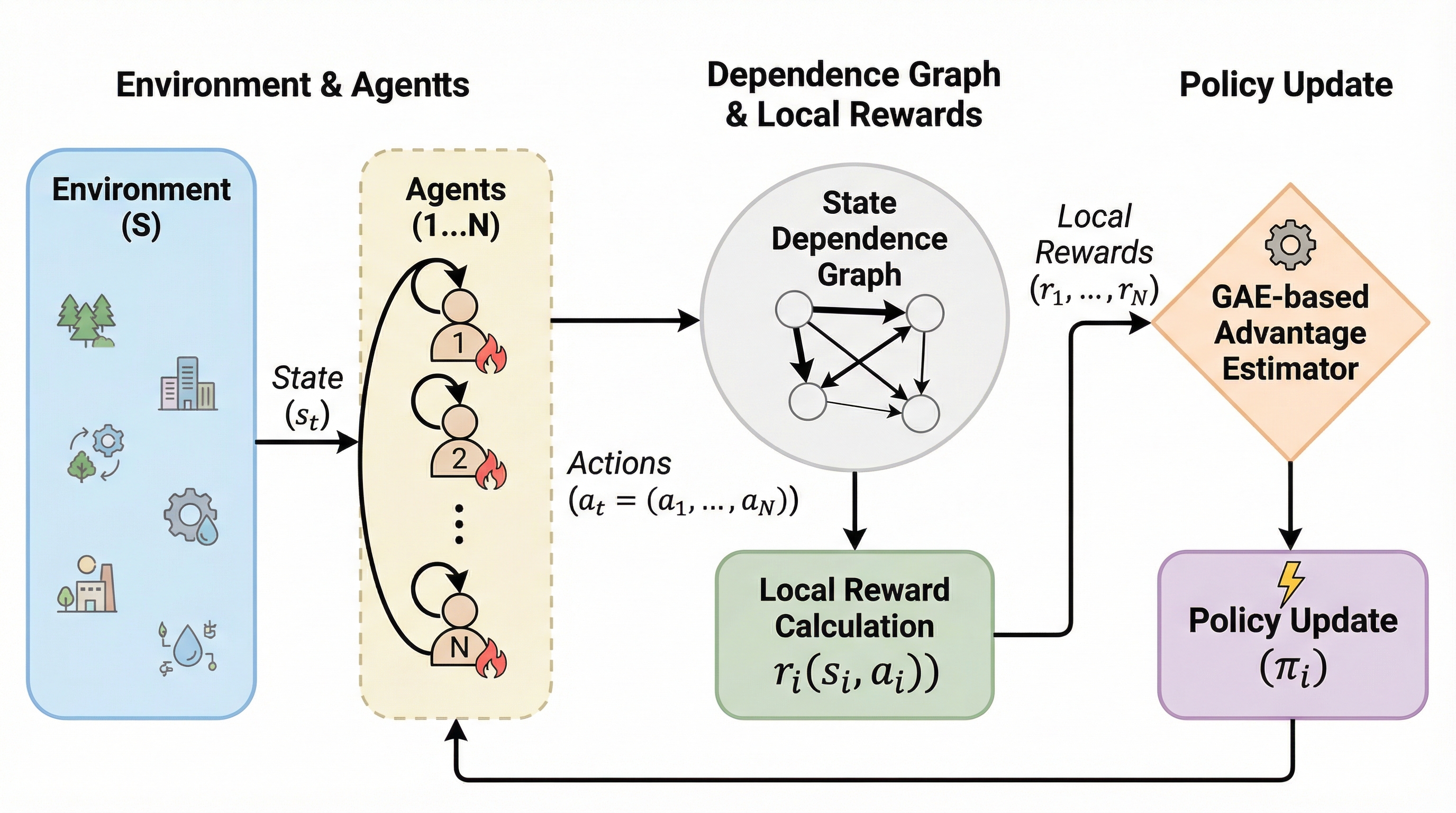 本研究の核心的な提案は、エージェント間の相互作用を表現する「依存グラフ」を活用し、局所報酬を適切に組み合わせることで明示的なクレジット割り当てを行う新しい方策勾配法である。 具体的には、ネットワーク化されたマルチエージェント・マルコフ決定過程(Networked Multi-Agent MDP)の枠組みを拡張し、状態の依存関係に基づいた報酬の計算を行う。 提案手法の第一の柱は、依存グラフ上の相互作用パスに基づいて、特定のエージェントの方策更新に関係のない局所報酬を切り捨てる「依存グラフ方策勾配」の導出である。 これにより、あるエージェントの行動が将来的に影響を及ぼす可能性のある他者の報酬のみを考慮対象とし、無関係なノイズを排除することが可能になる。…